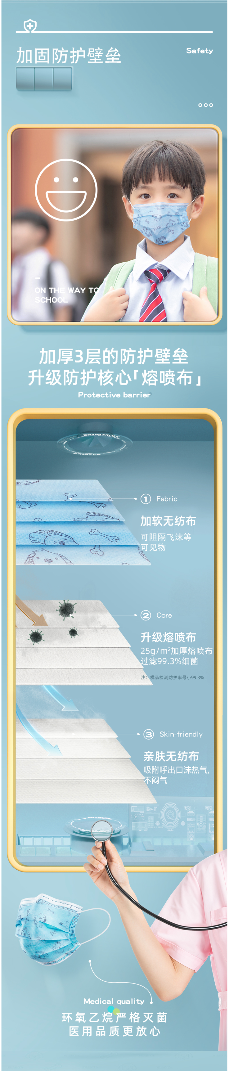 采用加软吸湿透气无纺布、升级加厚熔喷布过滤层和亲肤无纺布的3层结构,4D立体结构更贴合脸型,细菌过滤效率达98.7%,出厂前还使用环氧乙烷灭菌,是一款防护非常严谨的一次性口罩。