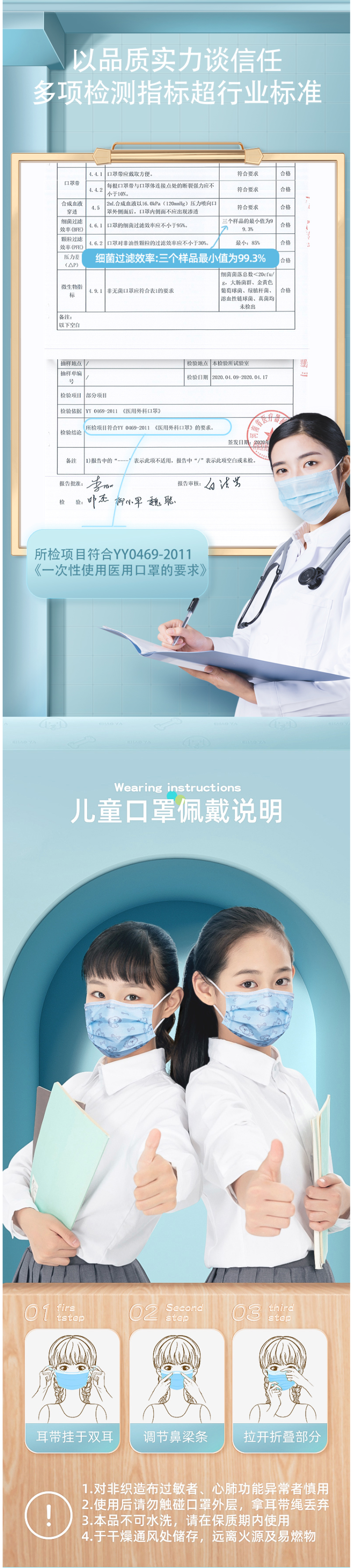 这款超亚一次性儿童口罩,属于医药推荐标准,所检项目符合YY0469-2011《一次性使用医用口罩的要求》,注册证号: 豫械注准20202140192,由河南省超亚医药器械有限公司生产。