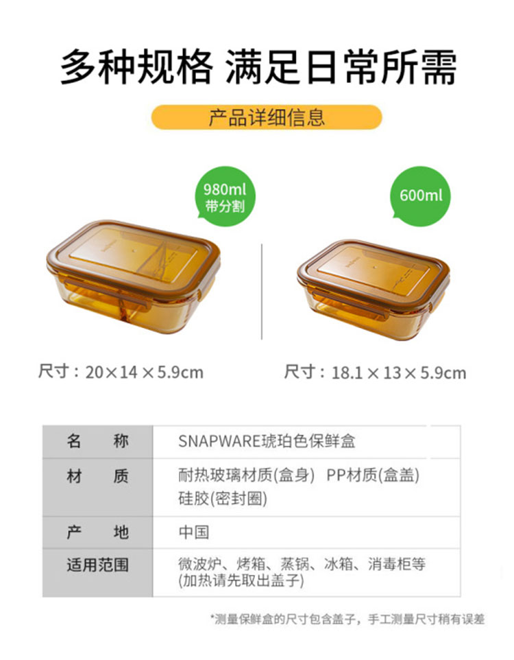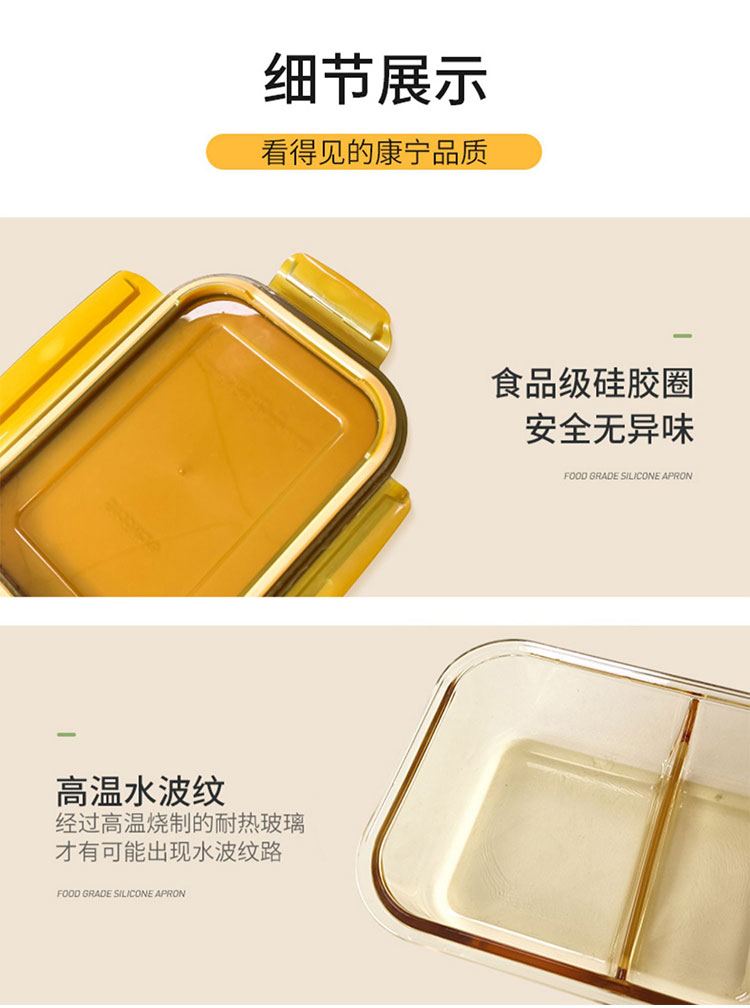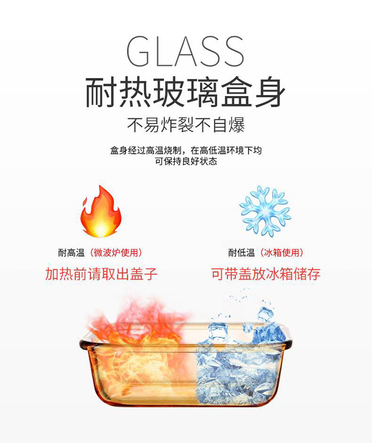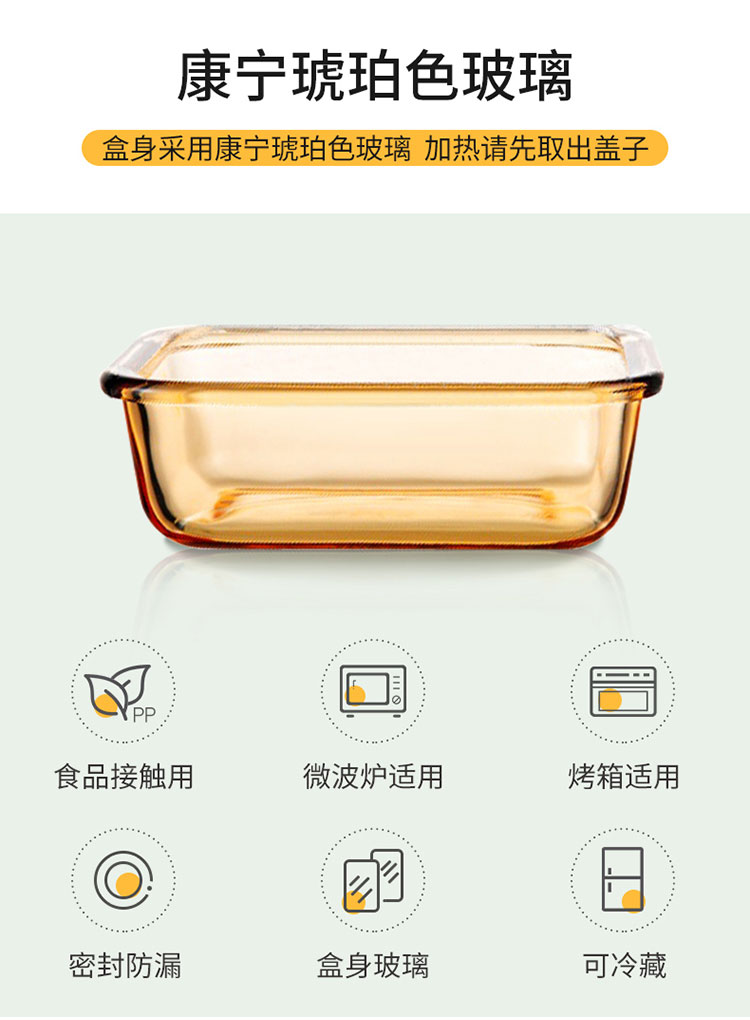 这款美国的康宁耐热玻璃保鲜盒,采用康宁PYREX耐热玻璃材质,食品级材质,材质安全无铅,符合美国FDA认证,可在微波炉和烤箱中使用。密封防漏,储存更方便。