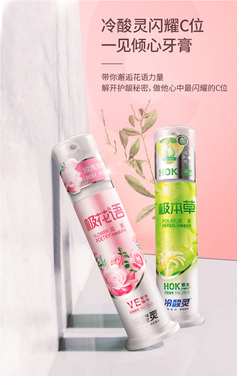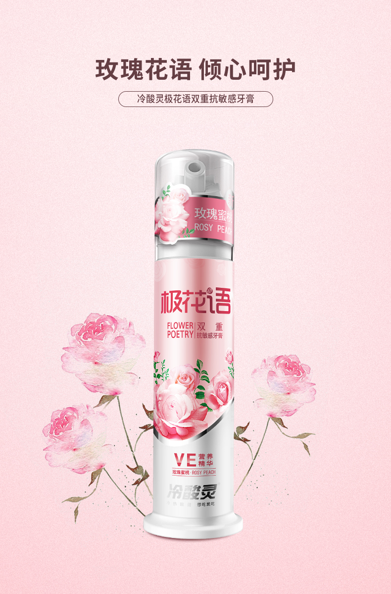 冷酸灵极花语双重抗敏感泵式牙膏:玫瑰蜜桃香、晶莹粉膏体。蕴含葡萄柚果及甘草中提取的天然成分,帮助抑制口腔有害细菌滋生,精粹大马士革玫瑰精油。
