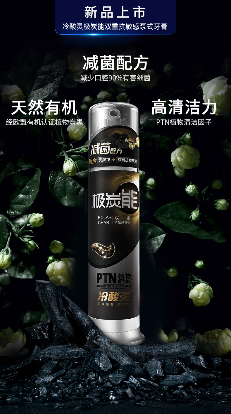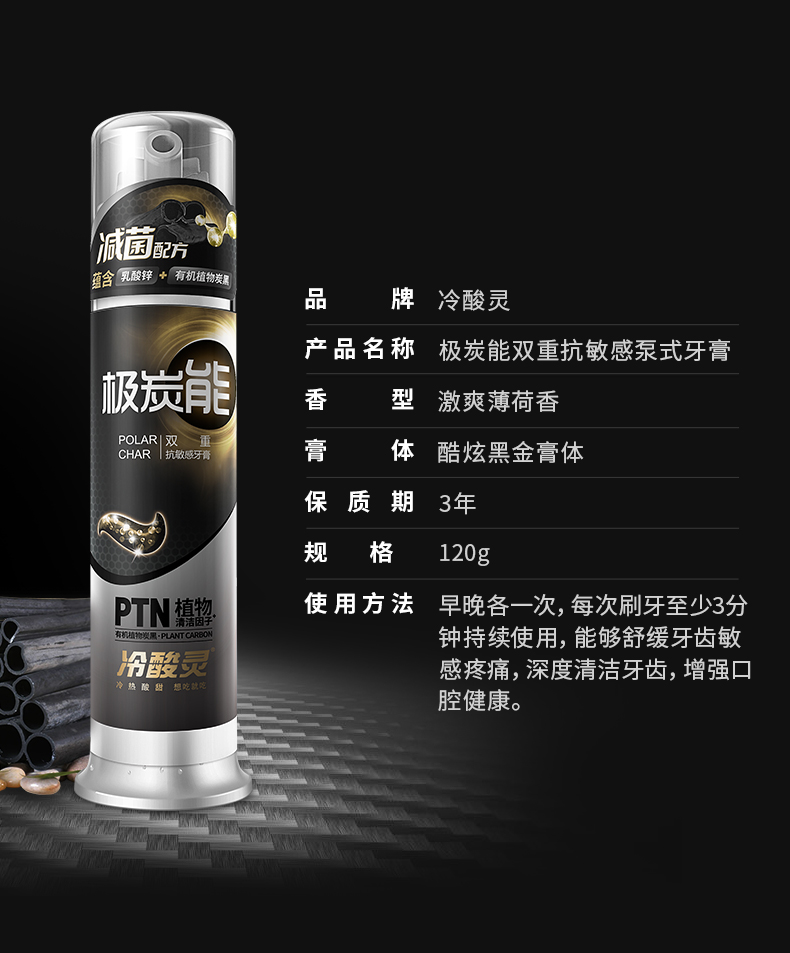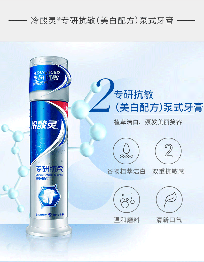 冷酸灵极地白泵式牙膏:海洋薄荷香、炫彩晶蓝膏体。特含天然谷物萃取洁白因子PHY,能高效分解附着在牙齿表面的色渍,形成光滑有机保护膜,全天减少牙齿色渍的再次附着,减少牙齿软垢回归。