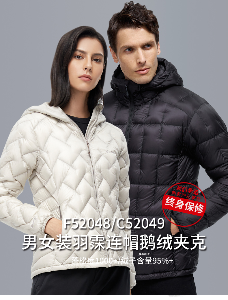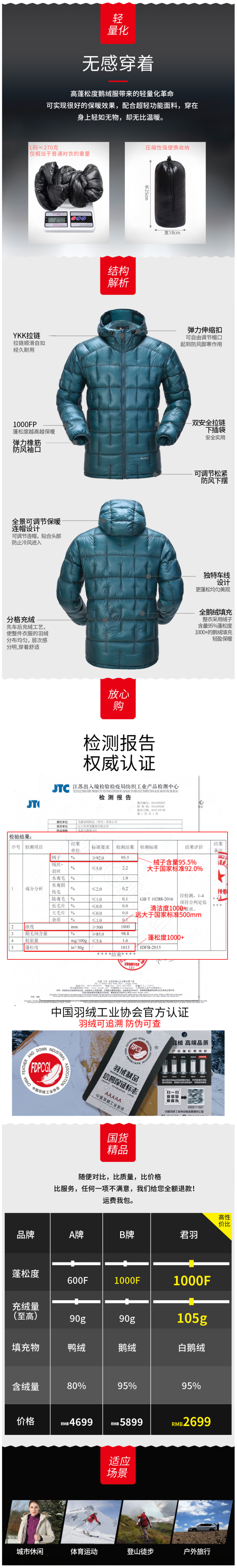 1000蓬是羽绒服的终极信仰,当下最高蓬松度,蓬松度是衡量羽绒品质最核心的指标。君羽这款是羽量级超轻羽绒服,填充1000蓬鹅绒,含绒量95%,充绒量男款L码96克/女款M码80克。