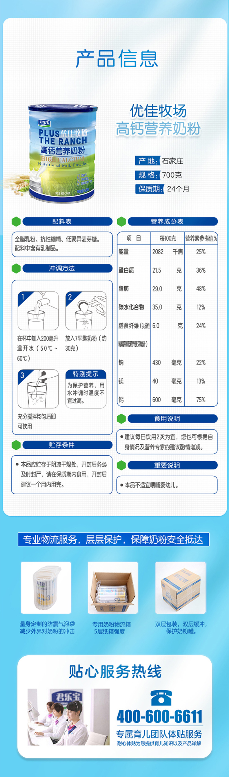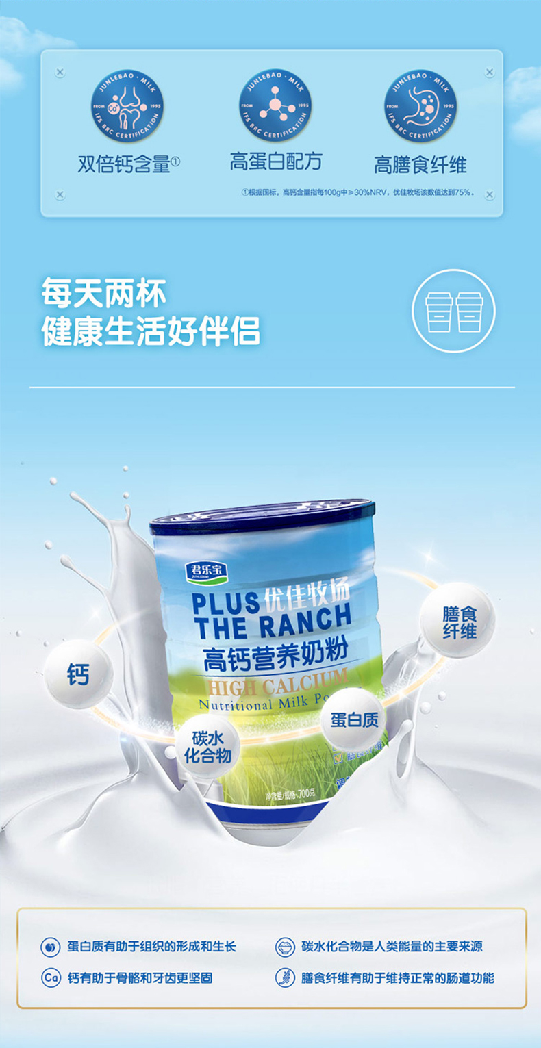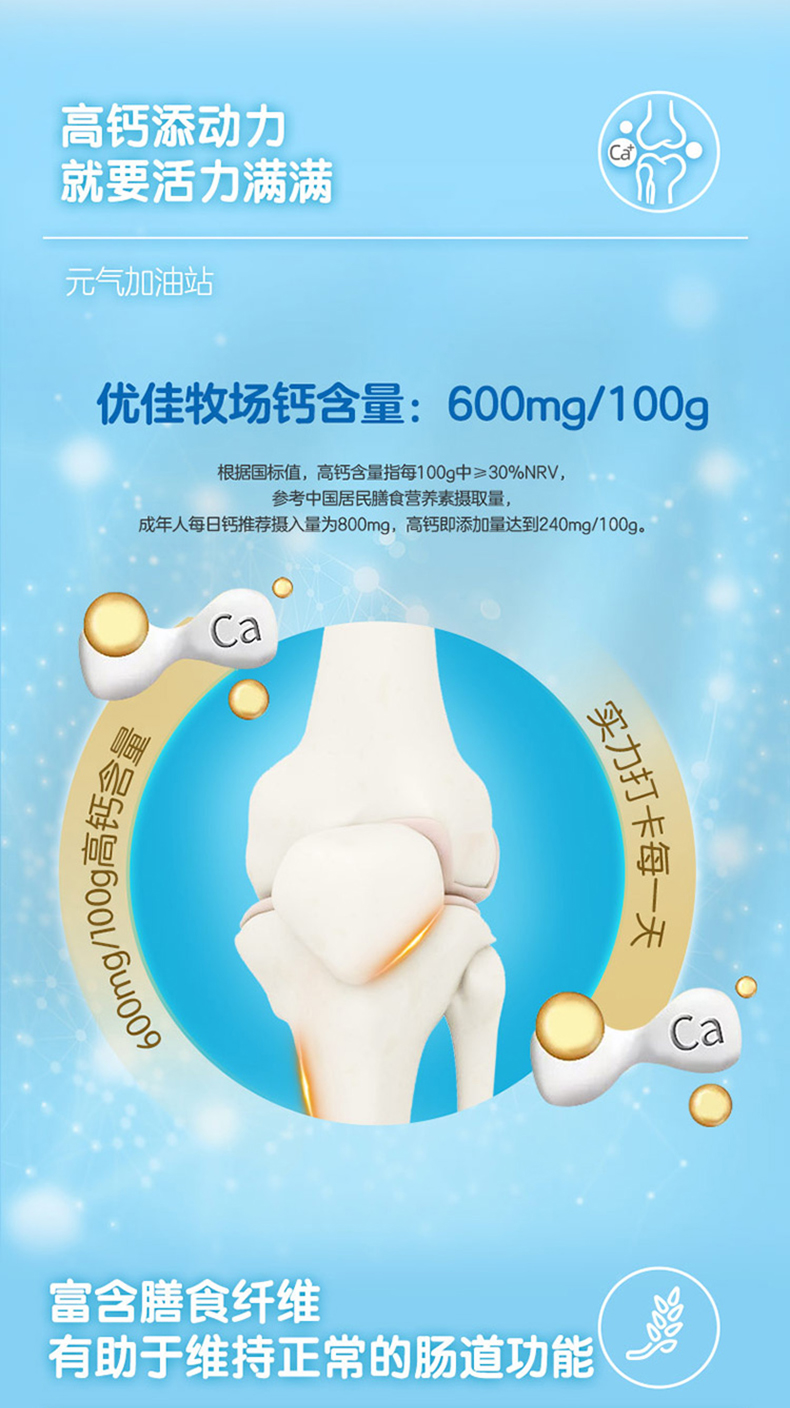 买一送一到手2罐,优佳牧场高钙奶粉,满足3岁以上人群所需营养。双倍钙含量,高蛋白配方,添加了高膳食纤维。有助于维持正常的肠道功能。满足全家人营养所需。每天来两杯,健康营养,与爱共享。