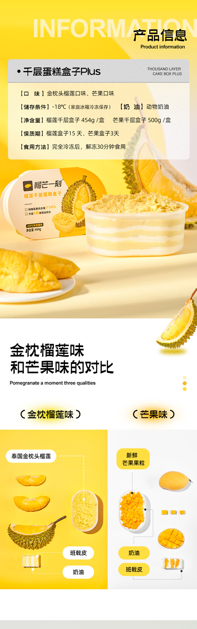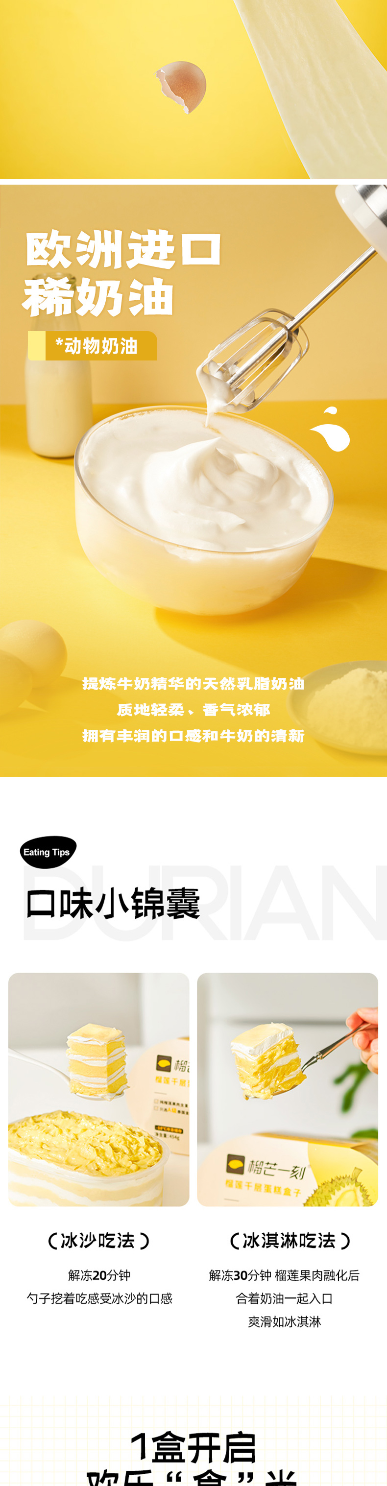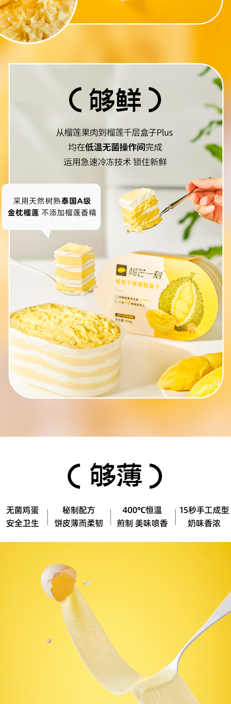 甄选泰国A级金枕榴莲肉制作,只用纯榴莲果肉、不添加榴莲香精、无防腐剂,工艺上在原有的基础上进行了改进和更新,千层皮也变得薄而多,新鲜饱满的果肉搭配欧洲进口动物稀奶油,奶香十足,给你不一样的味觉体验。五个字形容就是“皮薄,馅丰满!”