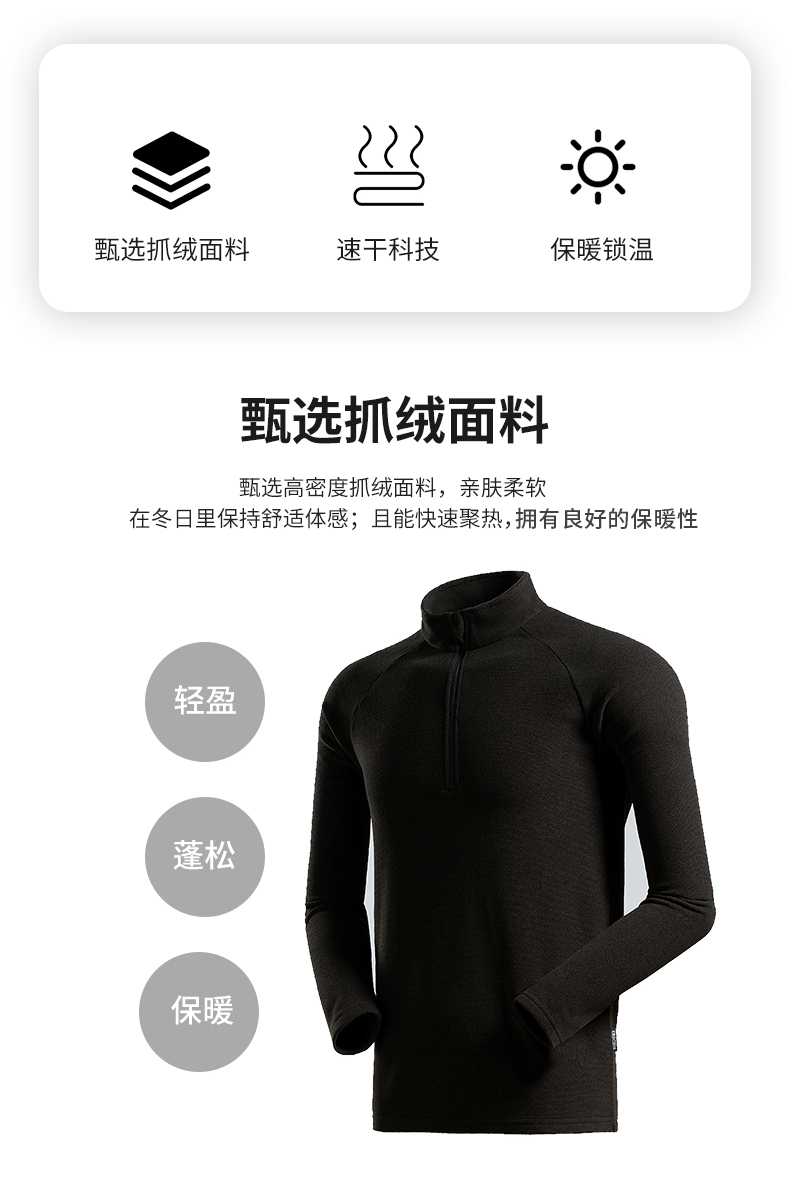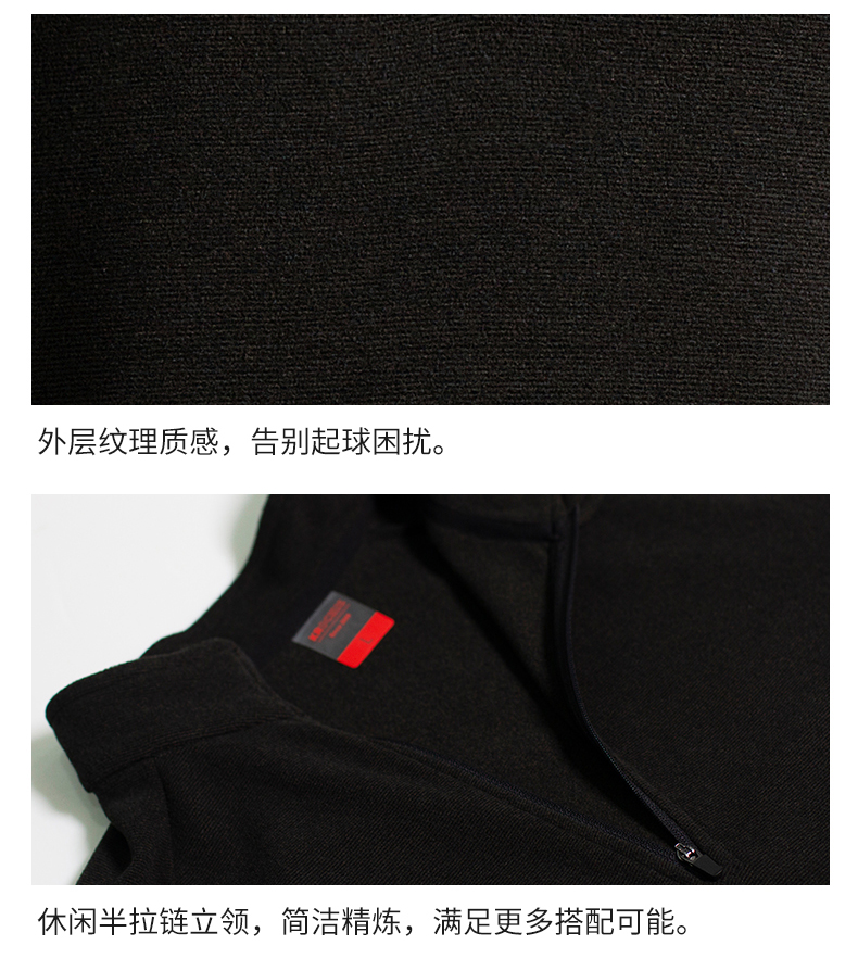 在款式和细节上,男女均修身版型,半开禁拉链立领设计,拉链顶端有护颚设计,不会刮伤脖颈。外层是纹理质感面料,避免了抓绒起球的问题。袖口和下摆采用双车线工艺,不易开线,无论是直接单穿或者作为中间保暖层都没问题。