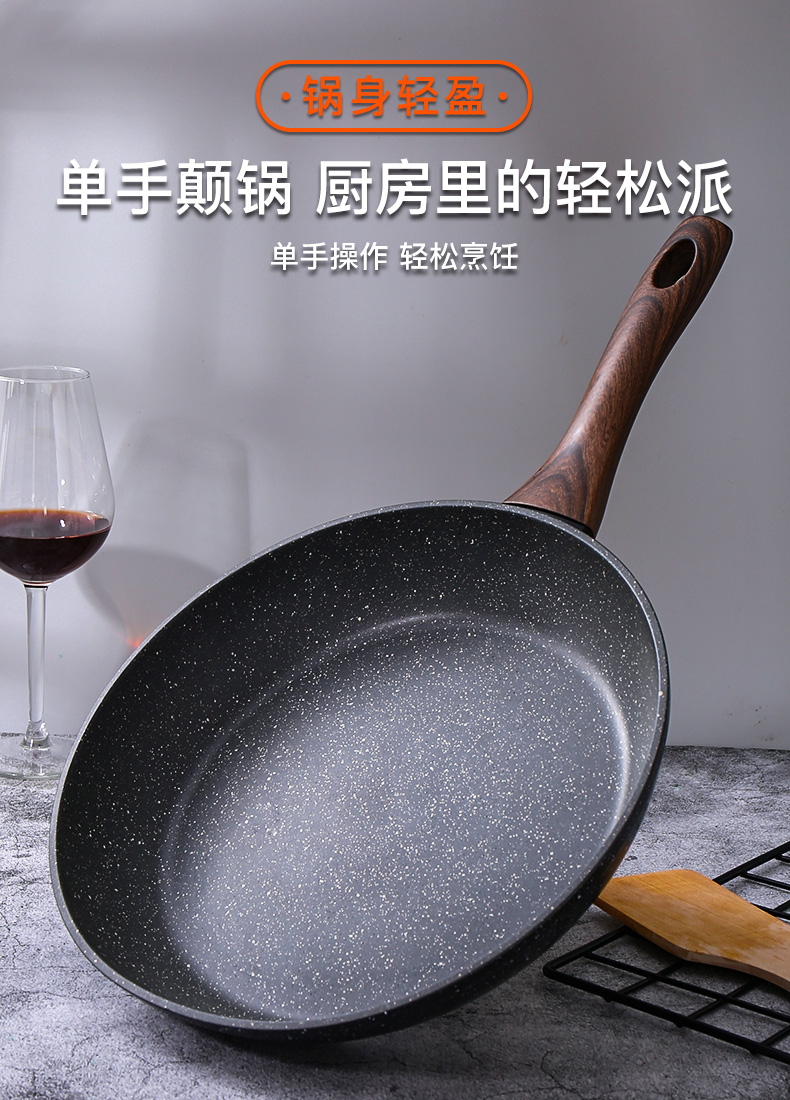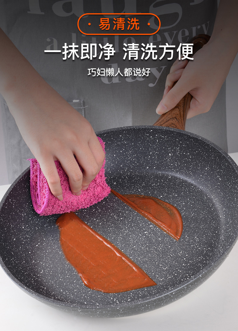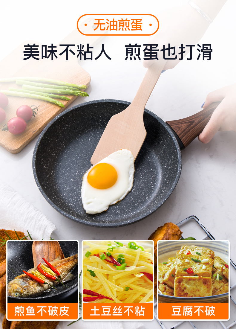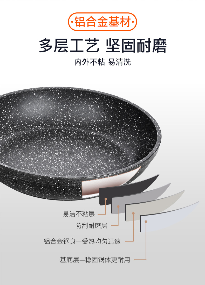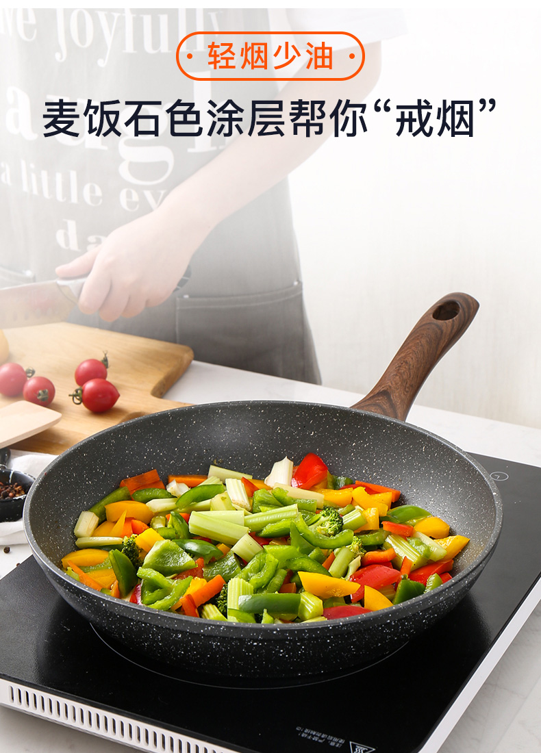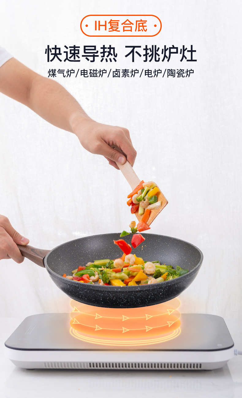 锅内表面为麦饭石材质,集不粘性、耐热性于一体,不粘锅底少油烟,一擦即净易清洁;锅底是IH复合底,升温快而均匀,在明火、电磁炉、电陶炉上都能用。