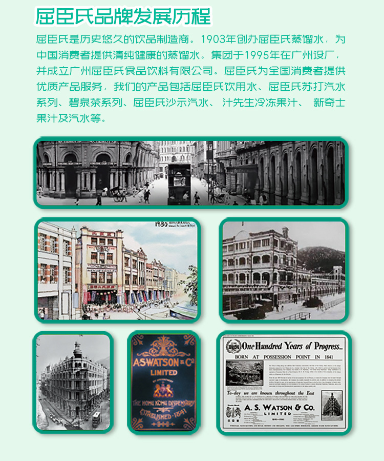 屈臣氏是历史悠久的饮品制造商。1903年 创办屈臣氏蒸馏水,为中国消费者提供清纯健康的蒸馏水。集团于1995年在广州设厂,并成立广州屈臣氏食品饮料有限公司。屈臣氏苏打汽水系列、碧泉茶系列、屈臣氏沙示汽水、菓汁先生冷冻果汁、新奇士果汁及汽水等。