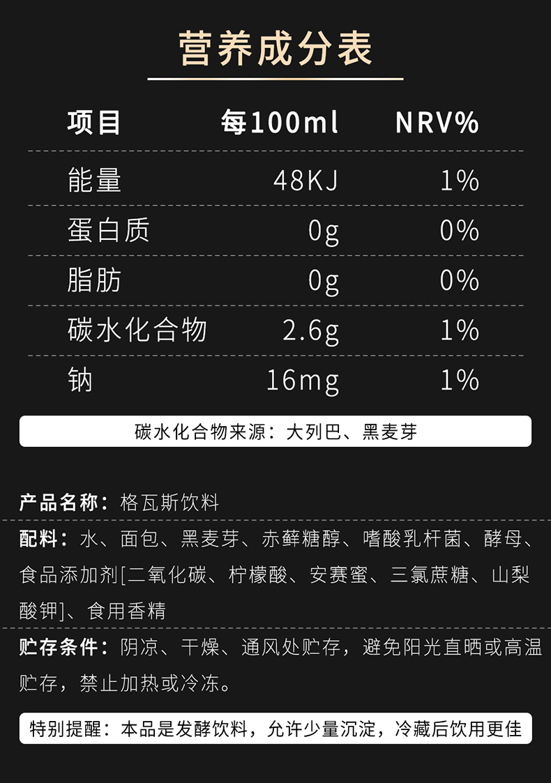 此款为秋林开发新品格瓦斯饮料,采用黑麦芽+俄式大列巴发酵,赤藓糖醇代替蔗糖,不伤牙齿不会给身体带来负担,非勾兑0色素0蔗糖0脂肪,酸甜适中,相比普通款风味更佳浓郁,冷藏4℃口感更佳。