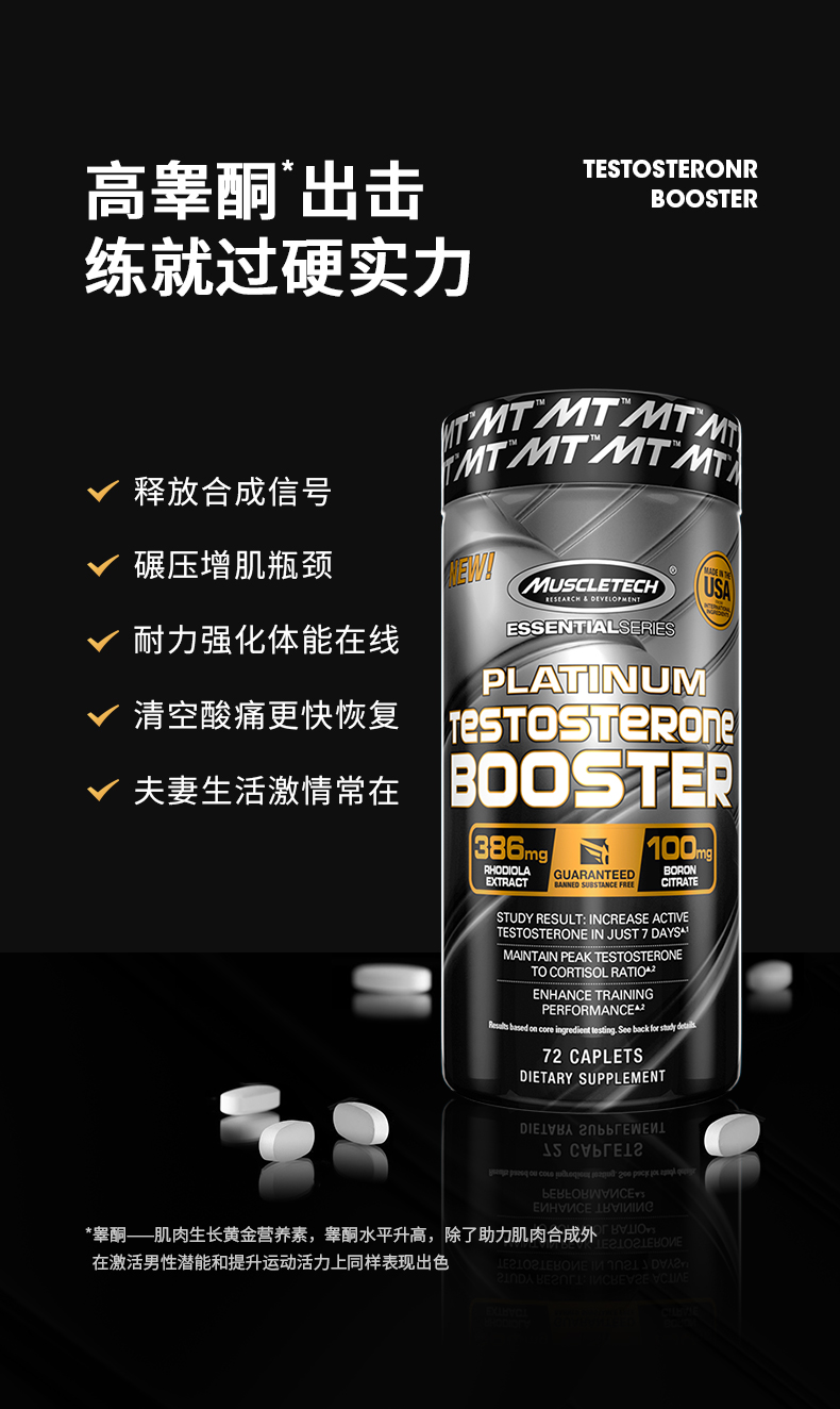 这款Muscletech 肌肉科技/麦斯泰克 黑金 六星促睾酮素,红景天+银杏叶提取物,2大植物配方;20S耐力升级,清退疲劳再练几组;5倍耗氧提升,呼吸自如体能攀升。