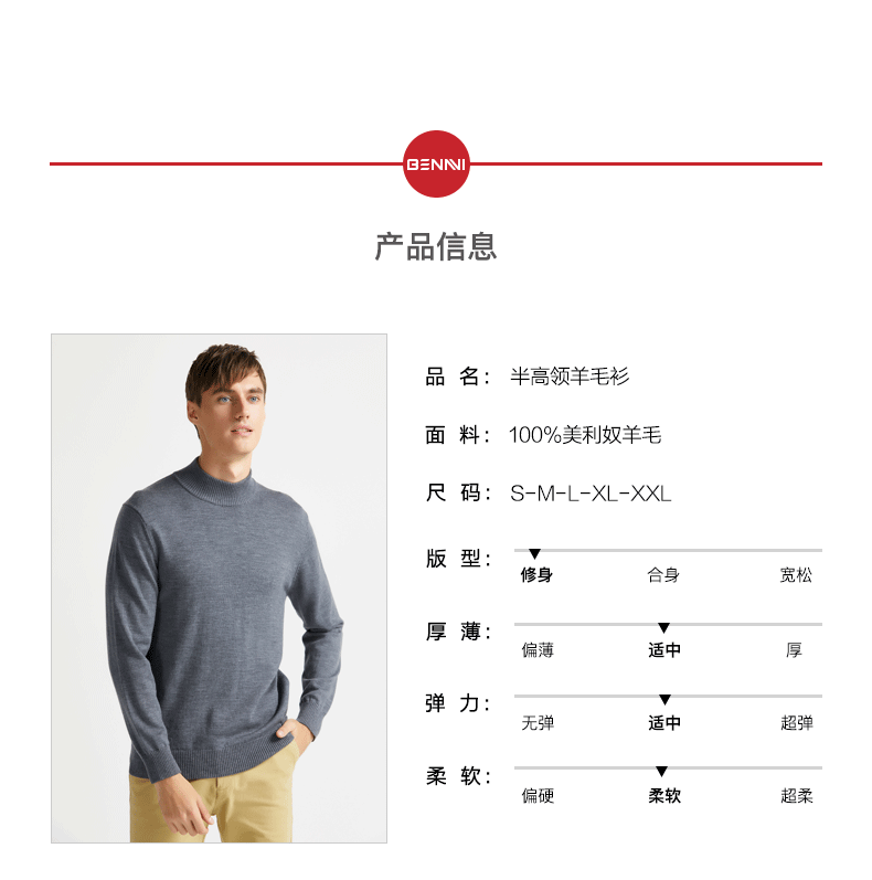 本米这款羊毛衫,采用100%澳大利亚美利奴羊毛(世界上顶级的羊毛),区别于普通的羊毛制品,面料顺滑不扎,贴身穿也没有毛刺感。