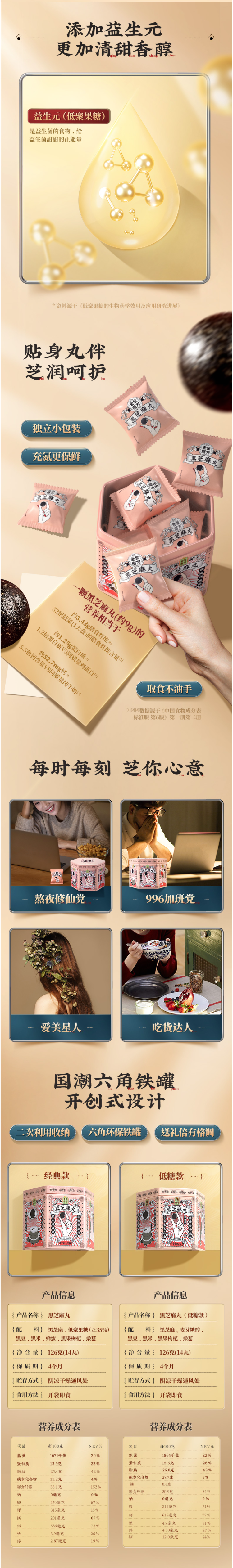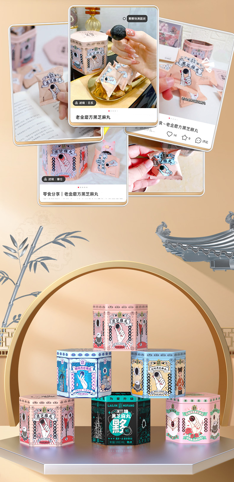选用当季黑芝麻,颗粒饱满,干净无杂质,香脆美味,清洗后高温烤制需要把握精准的火候;用蜂蜜代替糖调制蜜丸,口感稍甜却不腻,蜂蜜清润细腻,不粘牙。单颗独立包装,充氮保鲜。