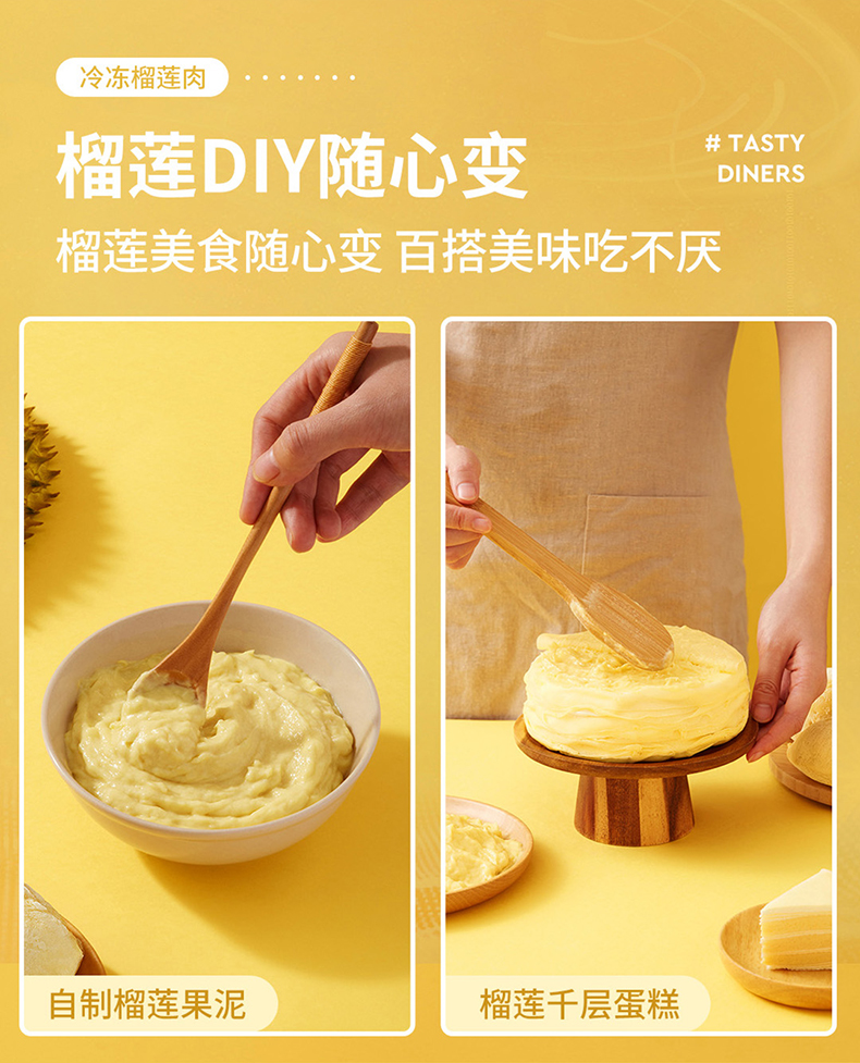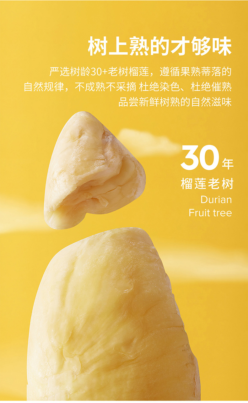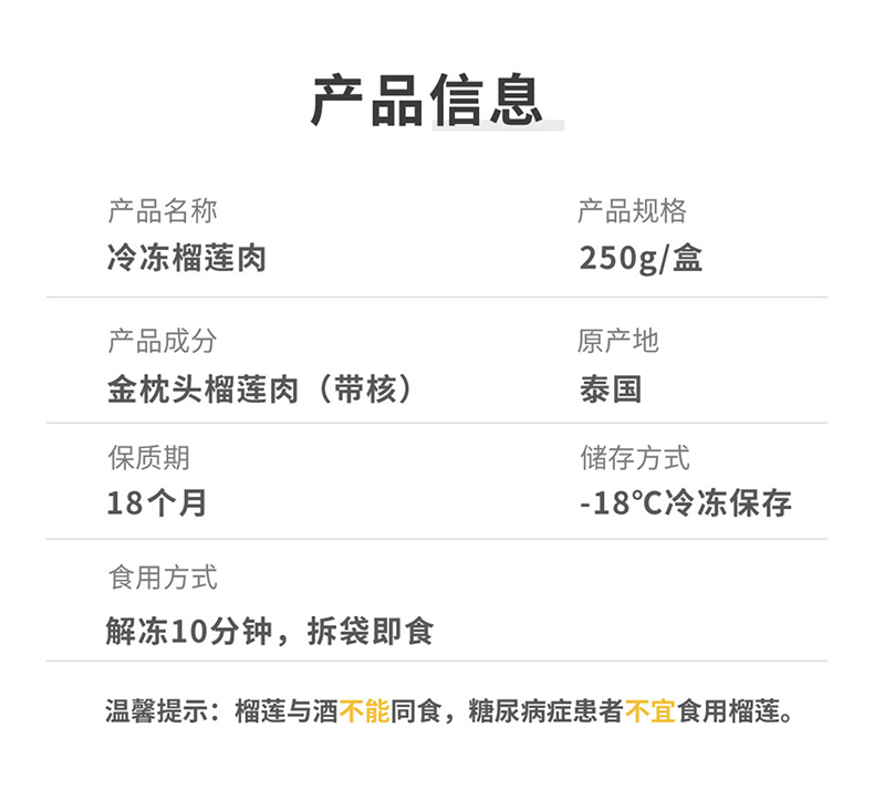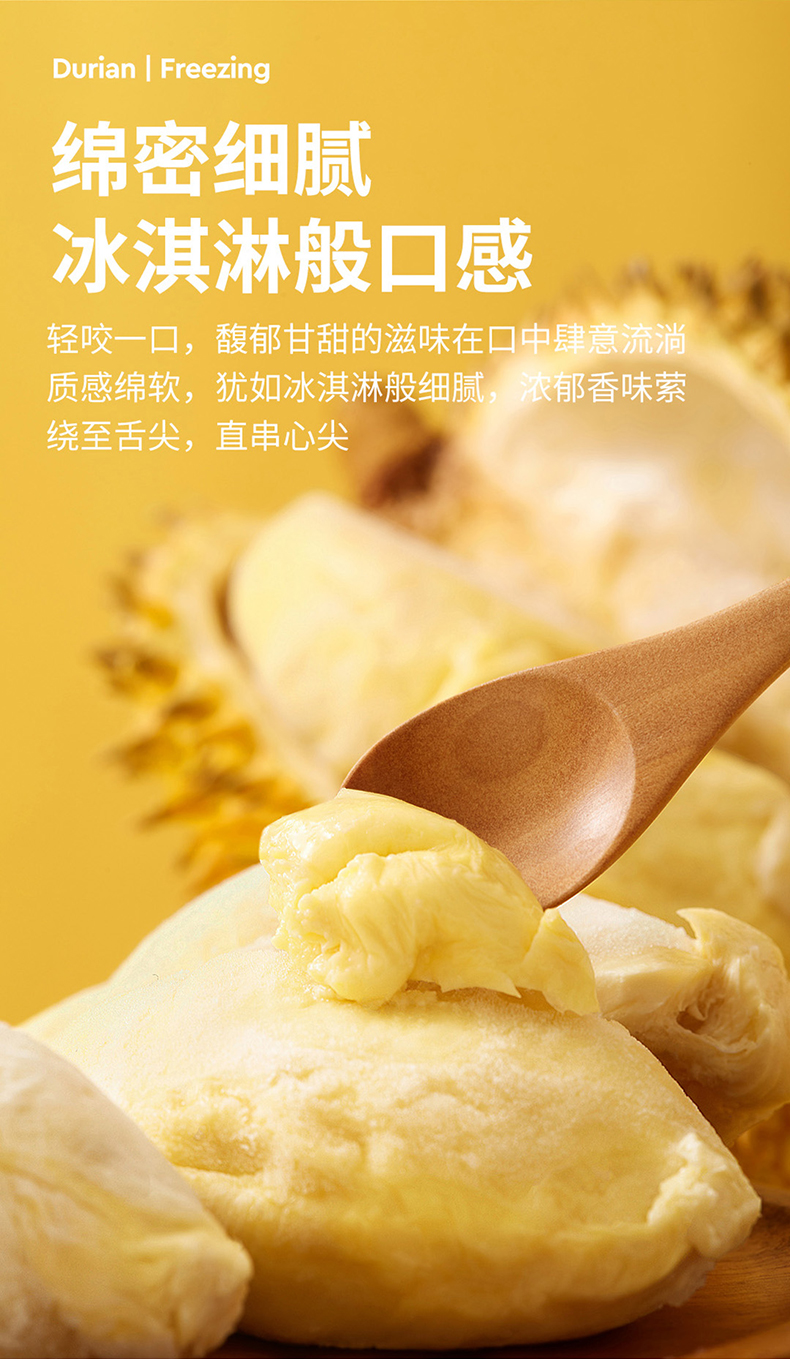 这款冷冻冰鲜榴莲肉(带核),精选泰国A级30年老树金枕头,只选28°甜A级果,自然成熟,不染色、不催熟、采摘后3小时内急速冰冻,不破坏细胞壁,不流失组织液,如同从树上刚摘下来的新鲜口感,入口甜蜜软糯、细腻绵滑,食后唇齿留香。