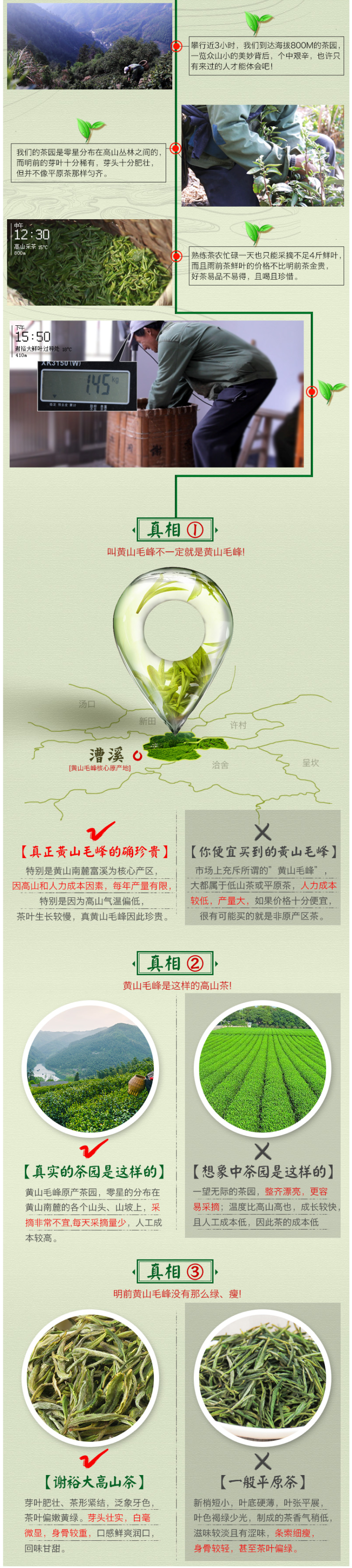 入杯冲泡雾气结顶,汤色清碧微黄,叶底黄绿有活力,滋味醇甘,香气如兰,韵味深长。由于新制茶叶白毫披身,芽尖峰芒,且鲜叶采自黄山高峰,遂将该茶取名为黄山毛峰。