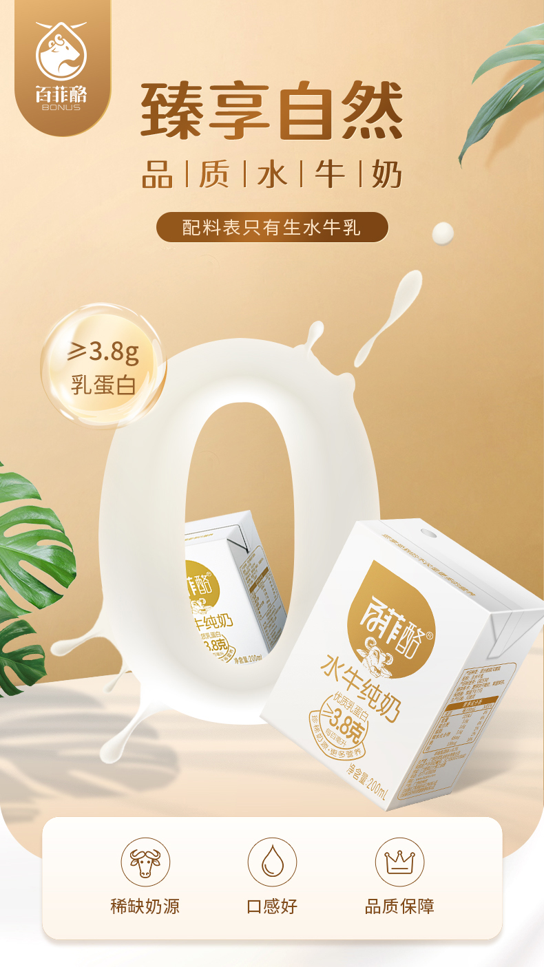 百菲酪水牛奶,来自著名的“中国奶水牛之乡”——广西灵山。100%的纯牛乳,没有任何添加剂,奶味醇厚,无腥味,比一般牛奶略浓稠,微带甜味,口感丝滑,有点像冰淇淋或者奶酪的口味,加热后牛奶表面会结出一层厚厚的奶皮,用来做甜品更棒