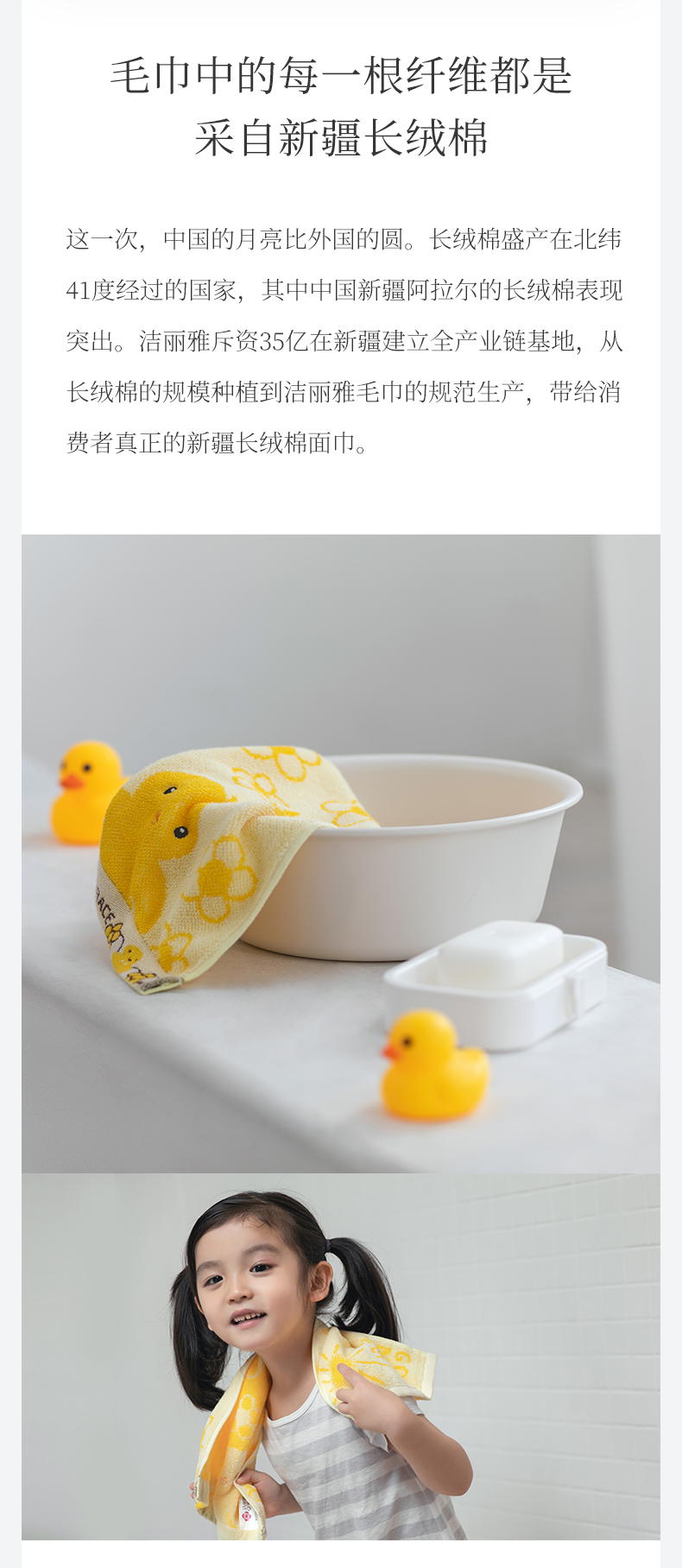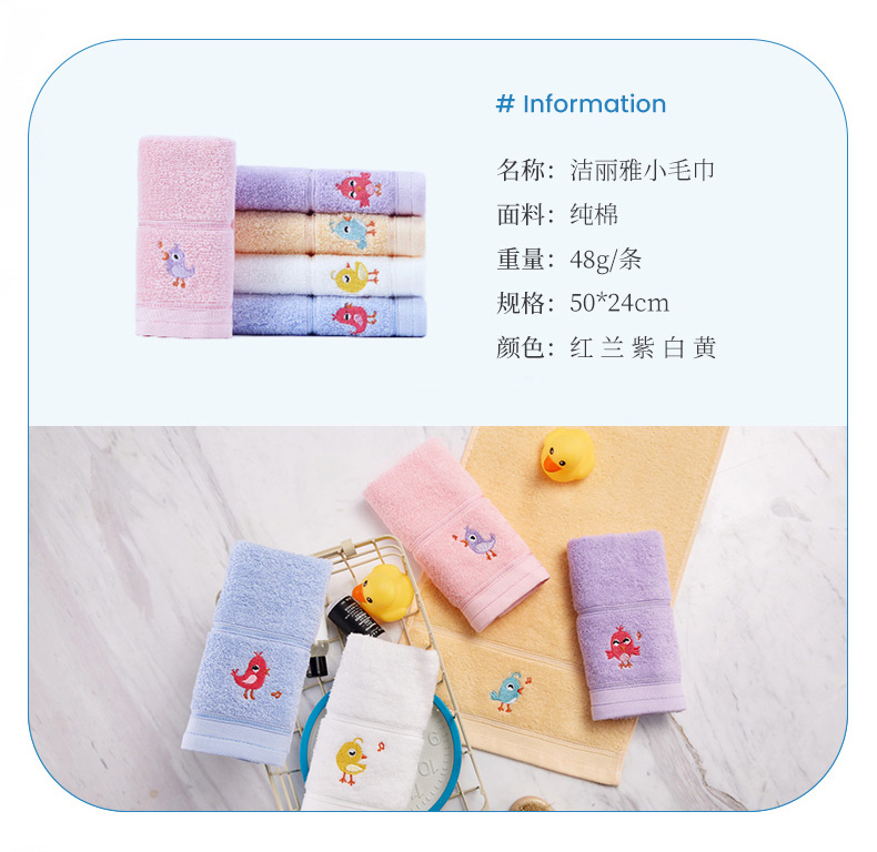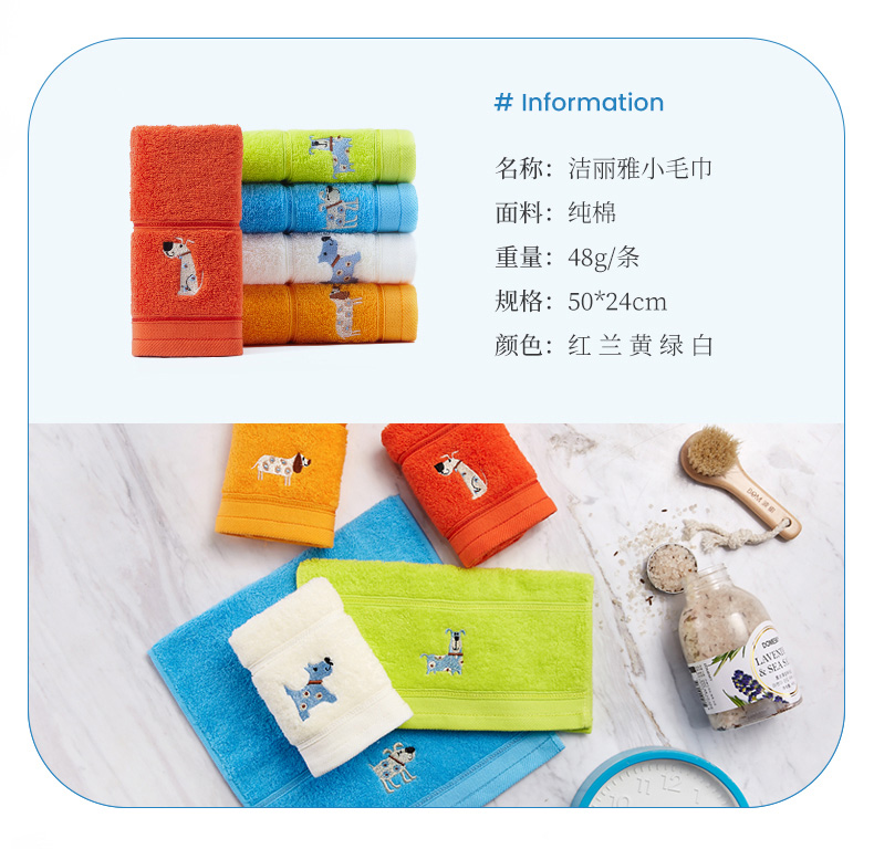 洁丽雅品牌,甄选长绒棉,纯棉材质,毛圈细腻整齐,拧干不费力,柔软触感,简约风格,亲肤吸水不掉色,可爱清新,多种颜色可选。让家居生活更精致。赠运费险领券链接点此