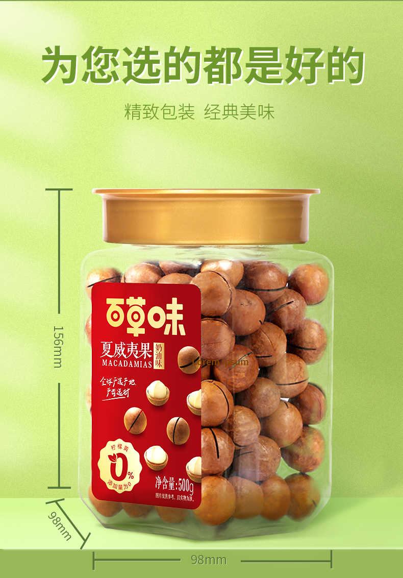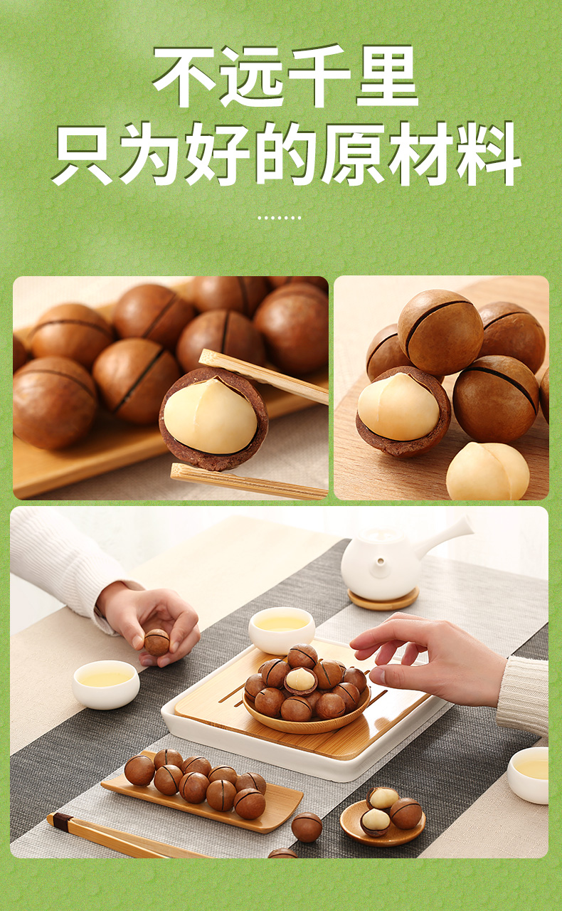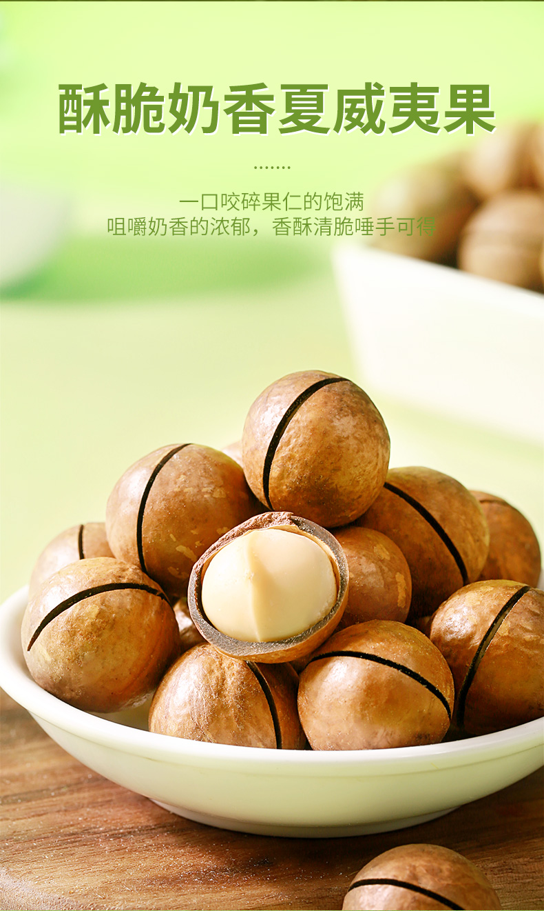 奶油味夏威夷果,选用南非进口的高品质夏威夷果,坏果少、果实饱满、味道自然纯正。经过轻加工,分级筛选、清洗、浸泡等工序后低温烘焙,保留了原味原香,300°大开口。好吃易拨开。