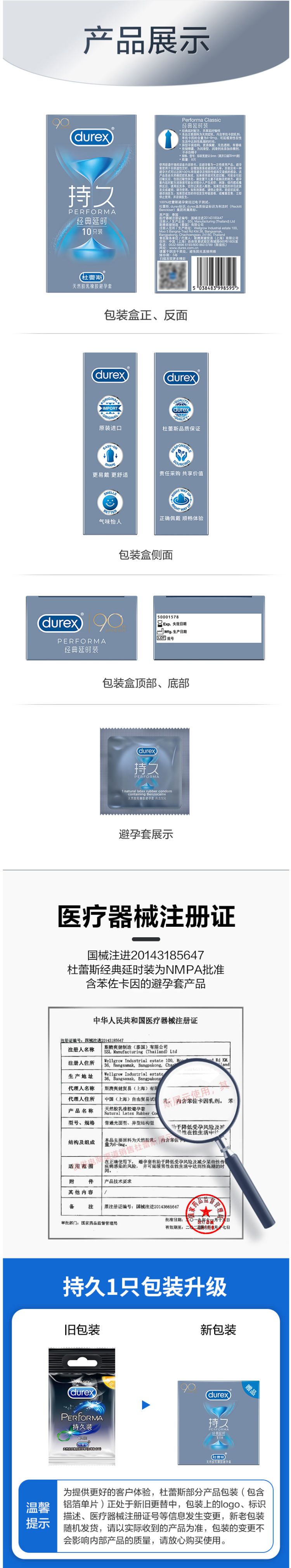 这款杜蕾斯 持久超薄避孕套,采用天然乳胶制成,产品如丝般轻柔,超薄超滑更敏感,含6-8mg的苯佐卡因成分,有很好的延时效果,而且不麻木见效快,安心征伐不停歇。苯佐卡因是医学上常用的脱敏成分,能降低男性的敏感程度。