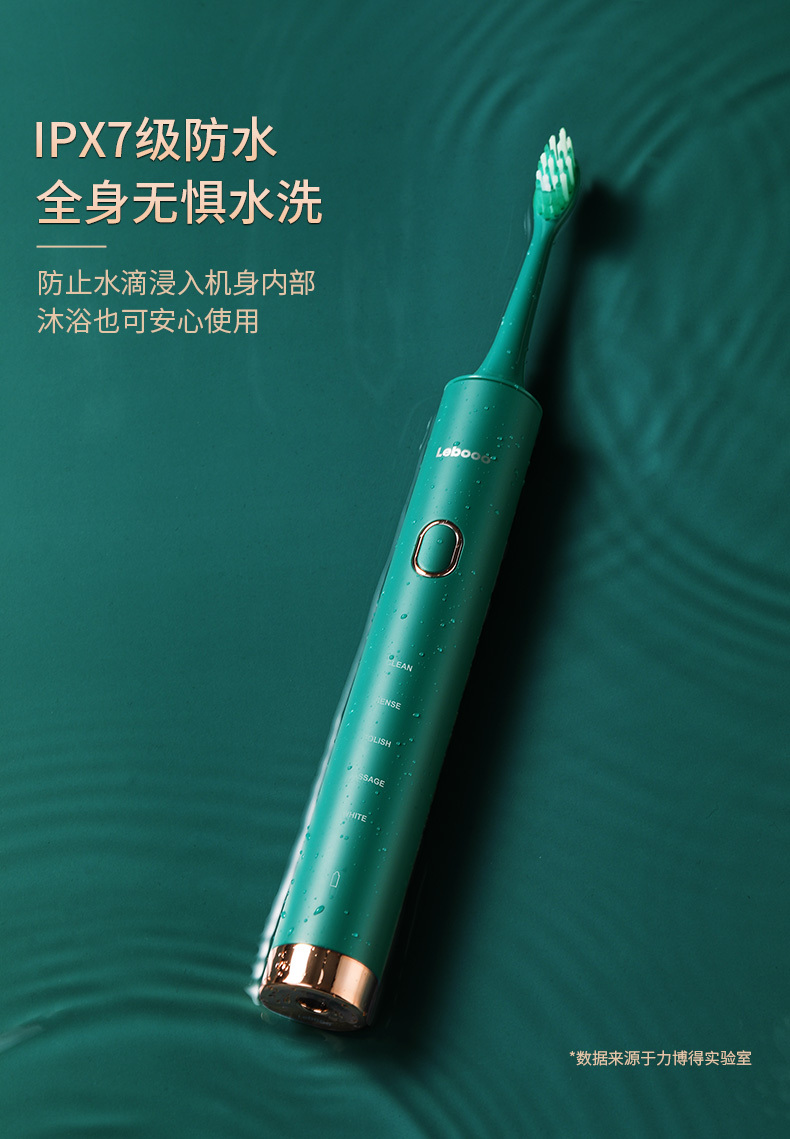这款力博得声波电动牙刷,华丽的外观质感,颜值在线,最高32000次/分钟高频振动,强效清洁,具有清洁、敏感、抛光、按摩、美白5档清洁模式,2分钟智能定时,每30秒振动瞬停,提醒更换清洁区域,均衡清洁口腔四个区域,以达到科学的清洁效果。食品级FDA杜邦刷毛,高密度植毛,磨圆处理,避免伤害牙龈,采用高性能锂电池,充电1次,45天持久续航,感应式充电,IPX7级防水,全身无惧水洗。