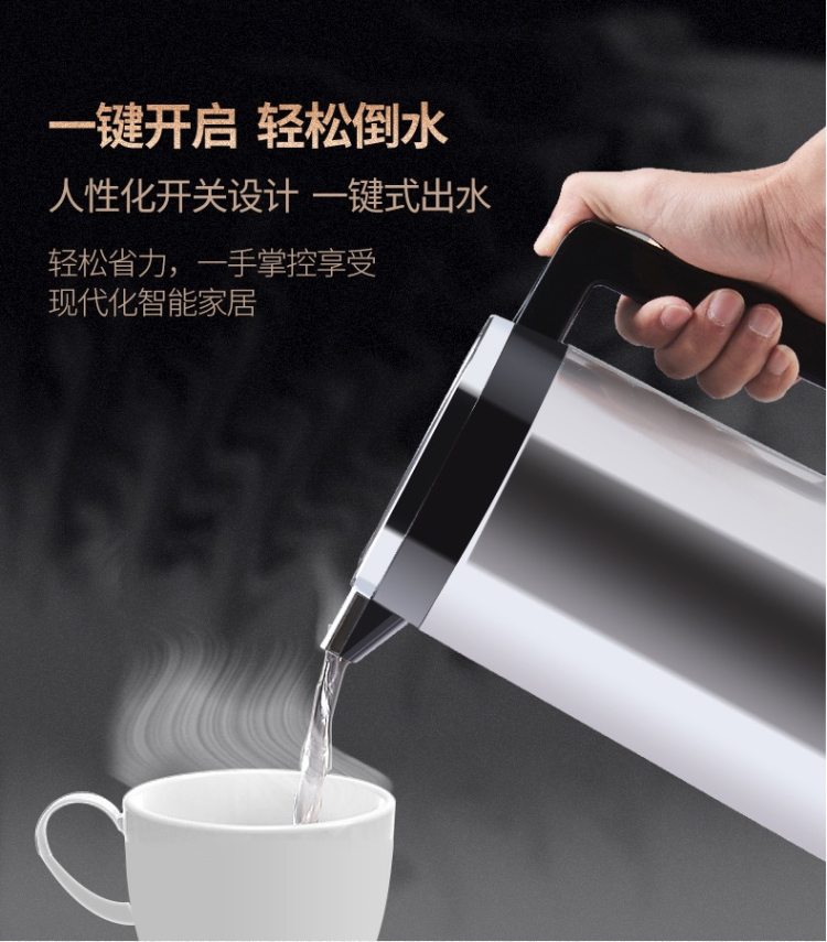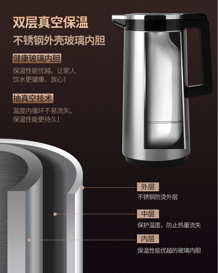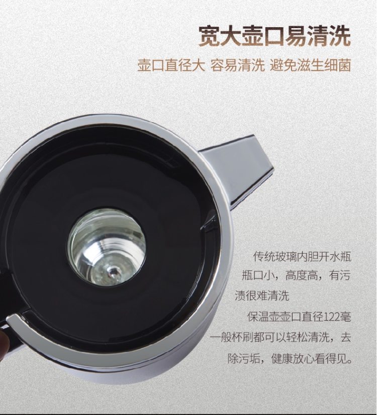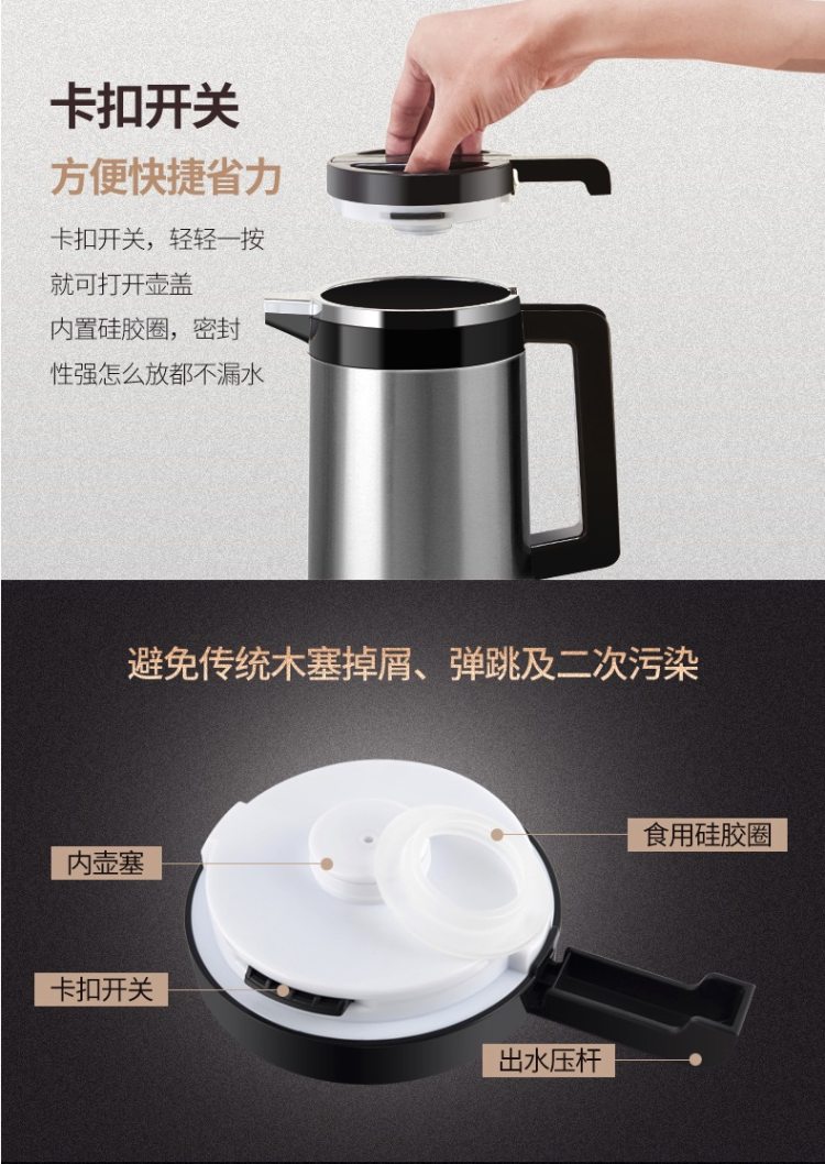 玻璃内胆耐-20℃—150℃的温差,无铅无毒,干净卫生;瓶盖是卡扣开关,轻轻一按就可打开壶盖,内置硅胶圈,密封性好;壶口直径为122mm,便于清洗,倾斜按压式出水,可直接单手操作。