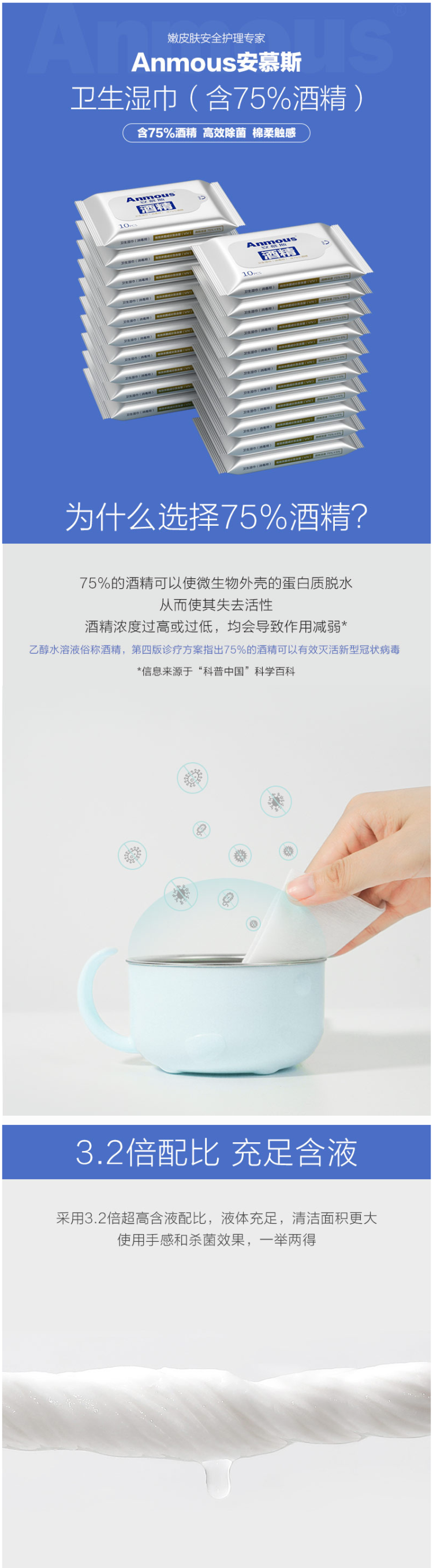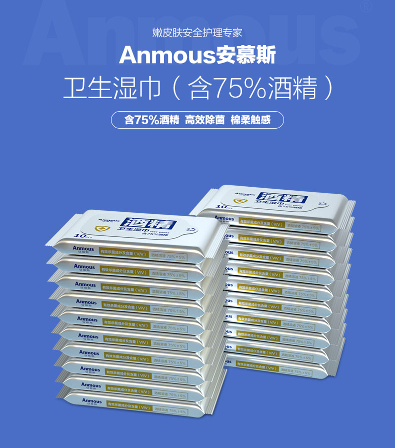 这款安慕斯Anmous加厚消毒湿巾,含75%酒精,可杀灭常见感染细菌病毒。采用3.2倍超高含液配比,液体充足,清洁面积更大,使用手感和杀菌效果兼得。