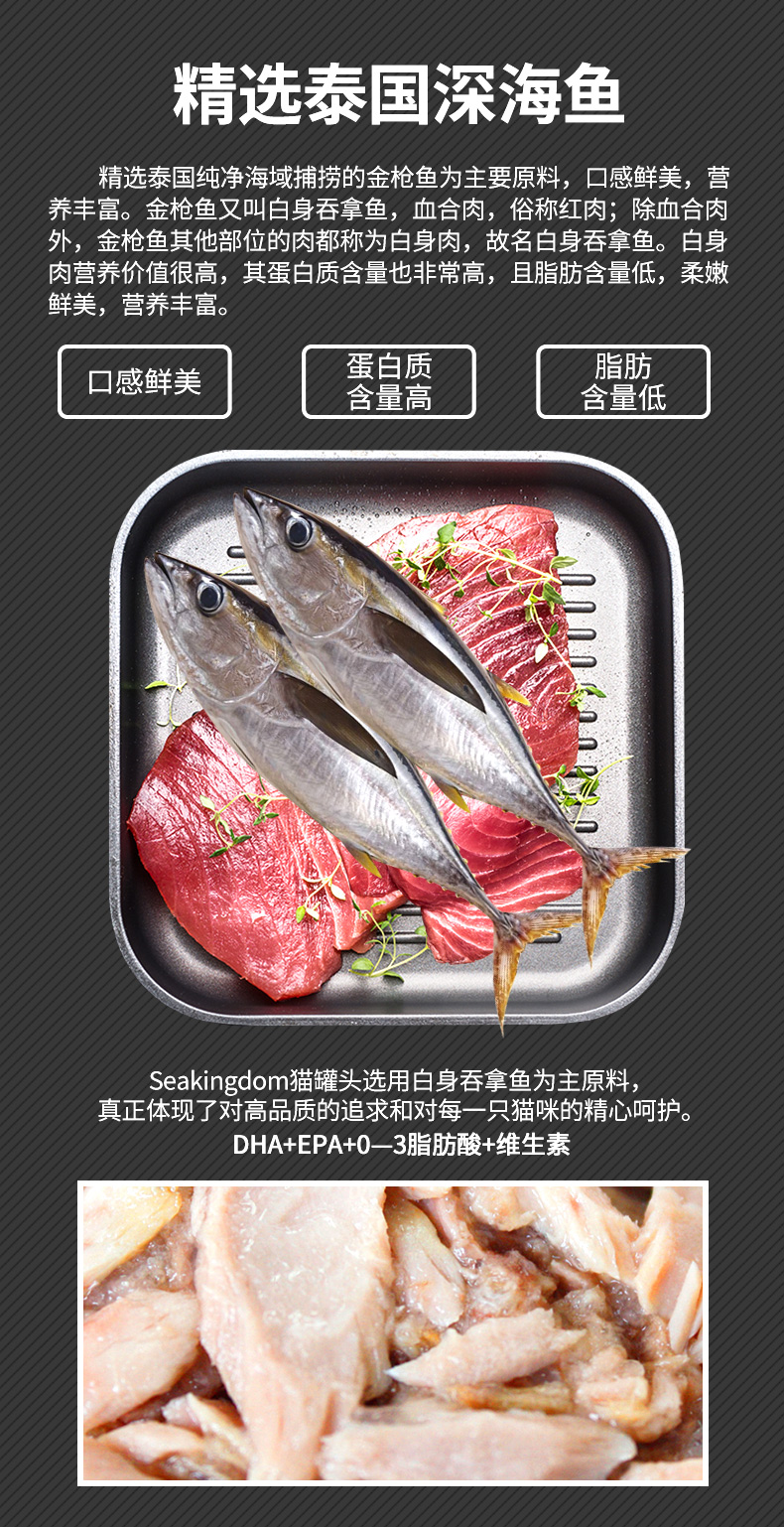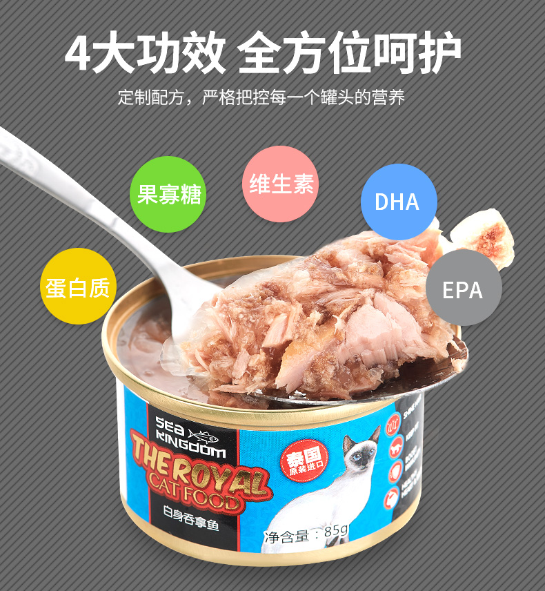 这款Sea Kingdom 白肉猫罐头,规格: 85g*10罐,精选泰国纯净海域捕捞的金枪鱼为主要原料,口感鲜美,营养丰富。金枪鱼又叫白身吞拿鱼,血合肉,俗称红肉;除血合肉外,金枪鱼其他部位的肉都称为白身肉,故名白身吞拿鱼。白身肉营养价值很高,其蛋白质含量也非常高,且脂肪含量低,柔嫩鲜美,营养丰富。