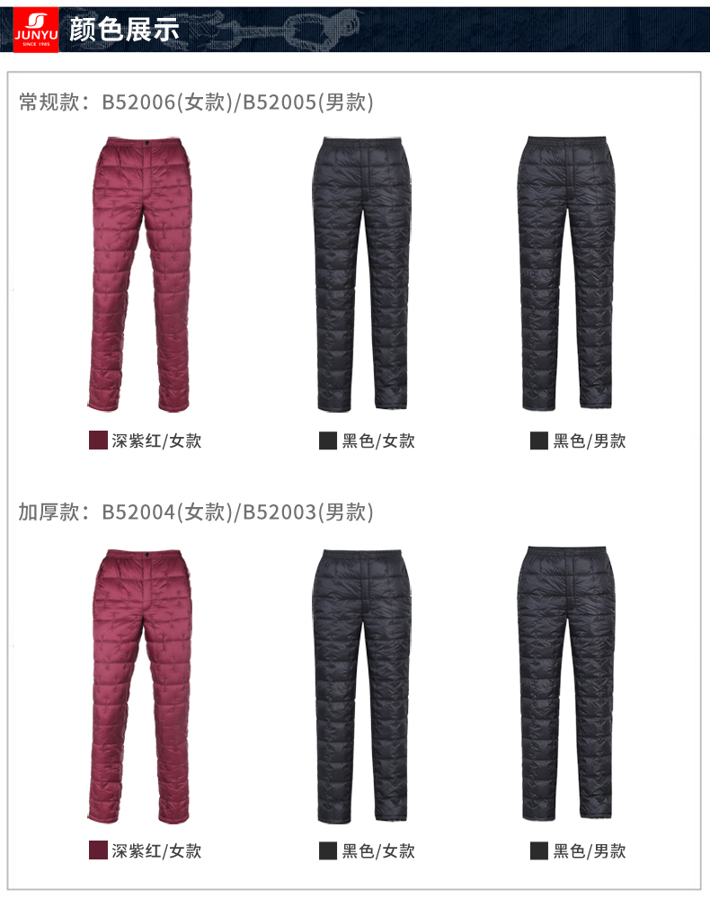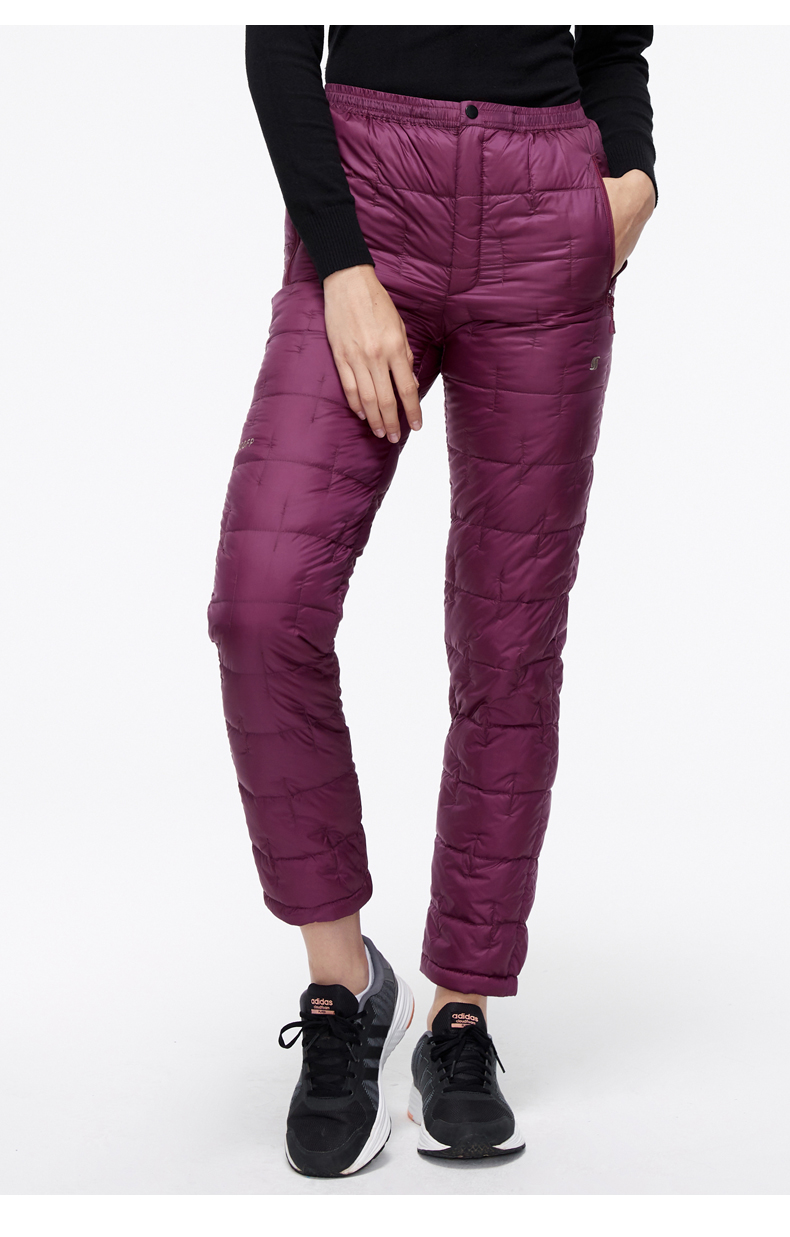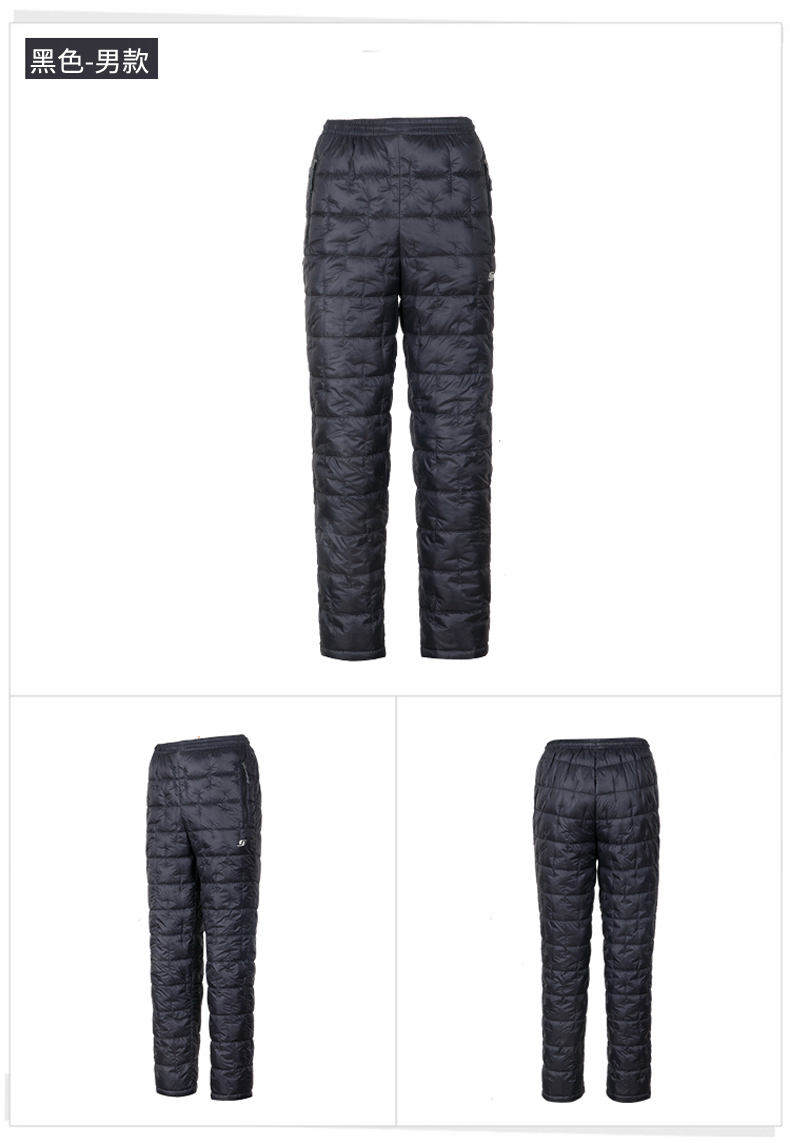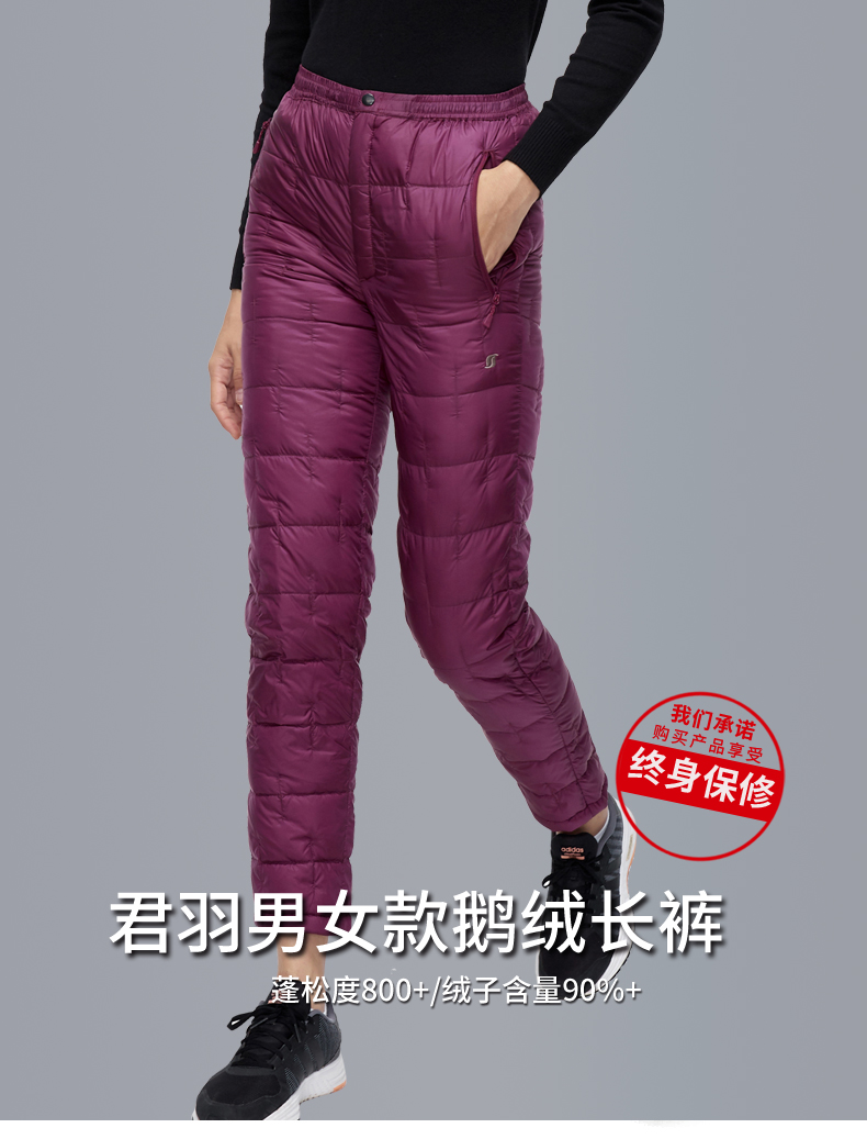 这款君羽男女羽绒裤,外层是日本东丽20D高密尼龙面料,防风防泼水,内里填充800蓬90%鹅绒,常规款充绒量55克,厚款充绒量73克,可以穿的轻便又暖和。