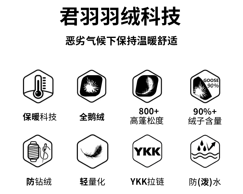 「鹅绒」800蓬鹅绒成本约是普通鸭绒的10倍,没有鸭毛的腥味,保暖效果更好;「55克 800蓬鹅绒」≈「71克 700蓬普通鹅绒」≈「101克普通鸭绒」。