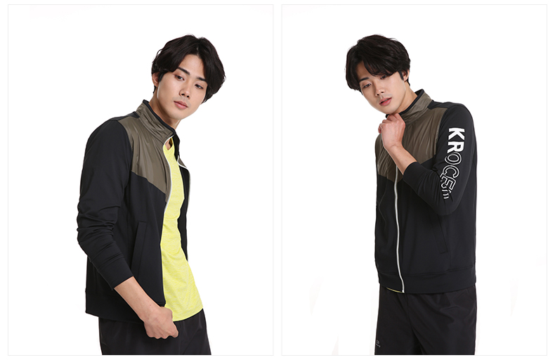 在款式方面,标准版型,因为面料带有弹力,稍微胖一些的人也能穿。胸前是梭织拼色设计,加上左袖子上大大的KROCESU的Logo,避免衣服太单调,增加了点休闲气息。