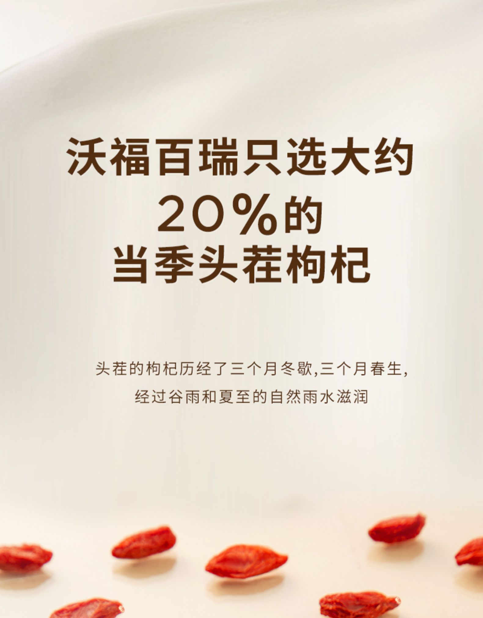 这款沃福百瑞 2022年特级头茬枸杞 ,规格:250g*2罐,只选大约20%的当季头茬枸杞,果粒大,上浮率高,饱满耐泡;久放干爽不结块,肉厚虎薄,粒粒分明;汤色清澈,泡水后颗粒圆润;入口微甜,后味回甘,不酸涩,干嚼更有劲。