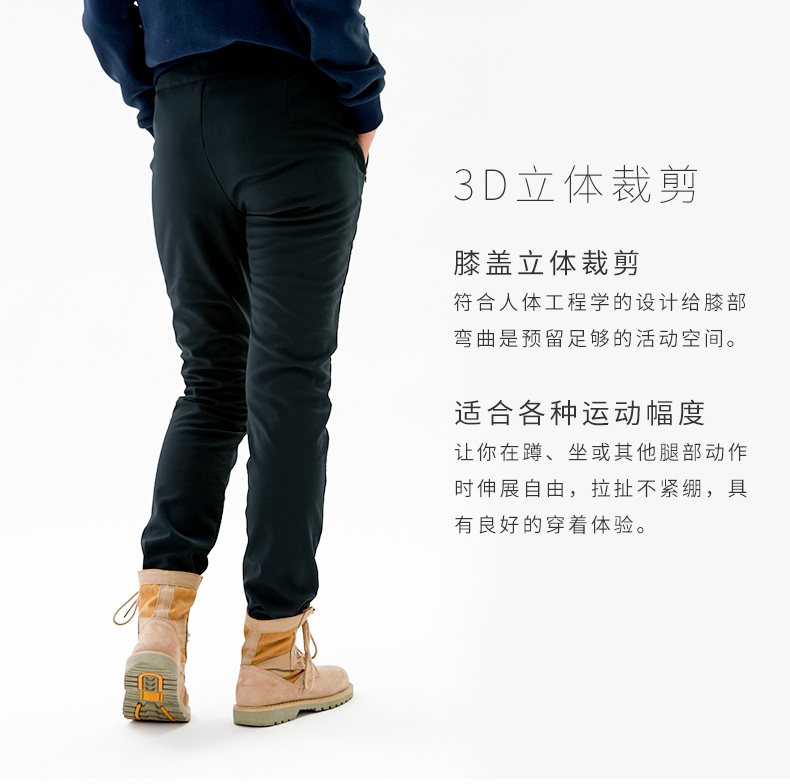 在款式和细节上,单从款式上看不出来是户外徒步裤,除了日常休闲,商务通勤也能穿。膝盖部分是3D立体剪裁,是按人体工程曲线裁剪打版制成,给膝盖在弯曲活动时留下了充足的空间,上身非常合体舒适。腰头两侧有橡筋带裤袢,无论是单穿或用腰带都行。