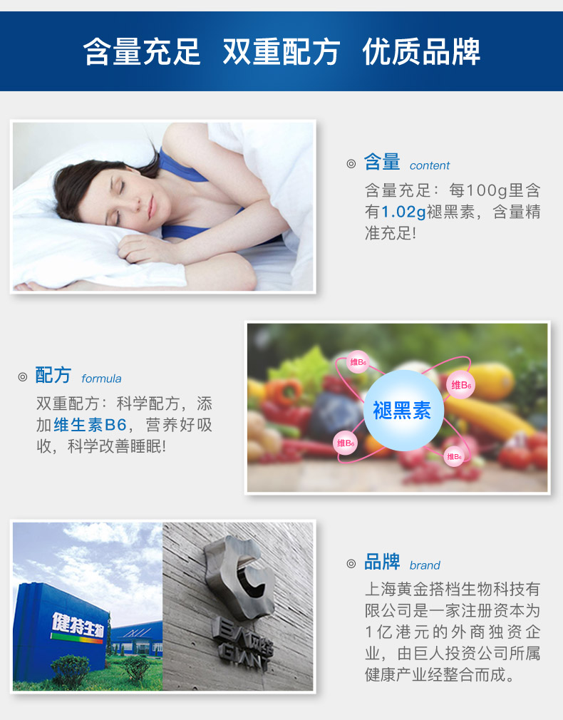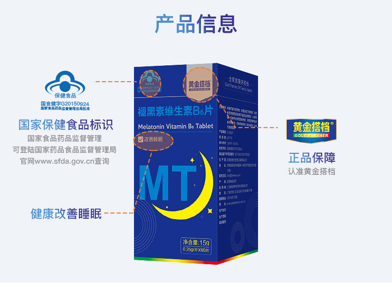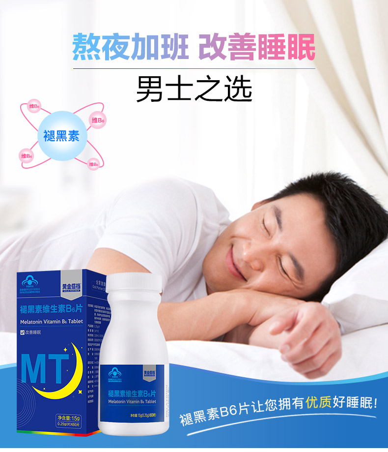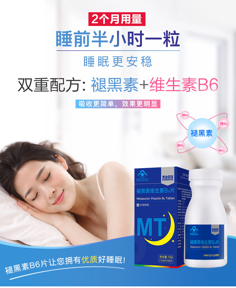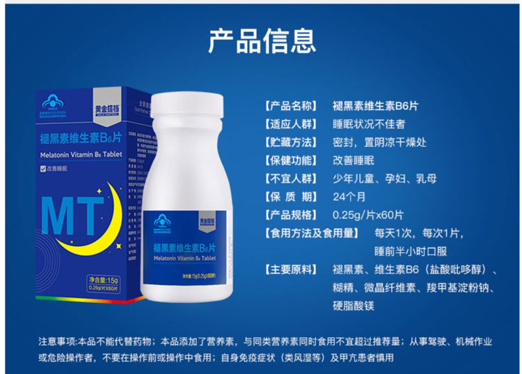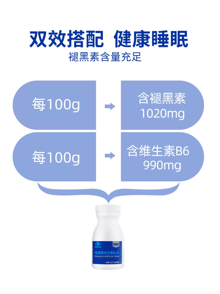 这款褪黑素维生素B6片,适合用于睡眠状况不佳者,每100g含1.02g褪黑素、0.99g维生素B6,可以改善睡眠、快速入睡。退黑素俗称"脑白金",又称"松果体素",是大脑松果腺体在夜间分泌的一种改善睡眠的激素,它不像其他激素那样只能影响某些特定的脏器,而是可以调节体内其他激素的平衡,补充人体内褪黑素可以提高免疫力,调节生理节律,内分泌系统和生殖系统。