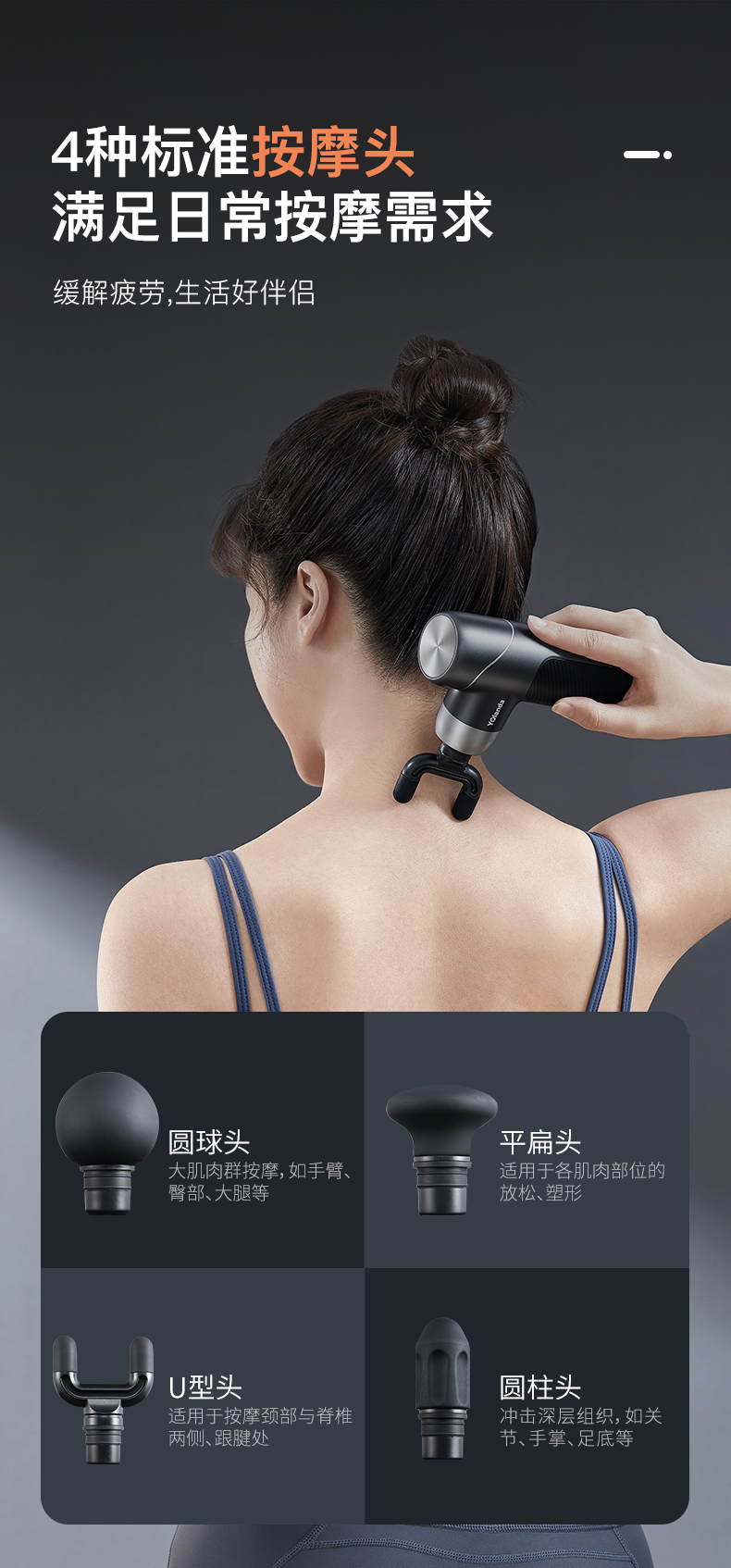 这款Yolanda迷你按摩筋膜枪,通过高频震动和大冲程放松筋膜,缓解肌肉酸痛,促进血液循环,采用3200转无刷电机,10kgf强劲动力,相当于1个成年男性按摩力道,深层按摩放松,4档变速,刚柔并济,1档1700转/min,肌肉唤醒,2档2200转/min,筋膜放松,3档2700转/min,分解乳酸,4档3200转/min,深度按摩。亲肤全硅胶按摩头,柔软舒适,经久耐用易清洗,4种标准按摩头,满足日常按摩需求。内置2000mAh锂电,15分钟自动断电,低档位运行,8小时持续续航,180天待机,临床医学建议,每次使用时长10-15分钟,续航能力30天。370g重量,可放入包包或口袋,轻巧便携。