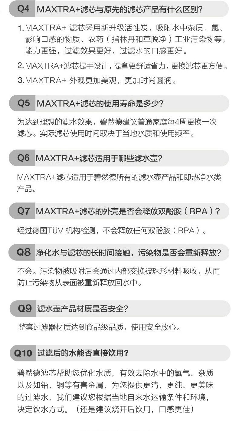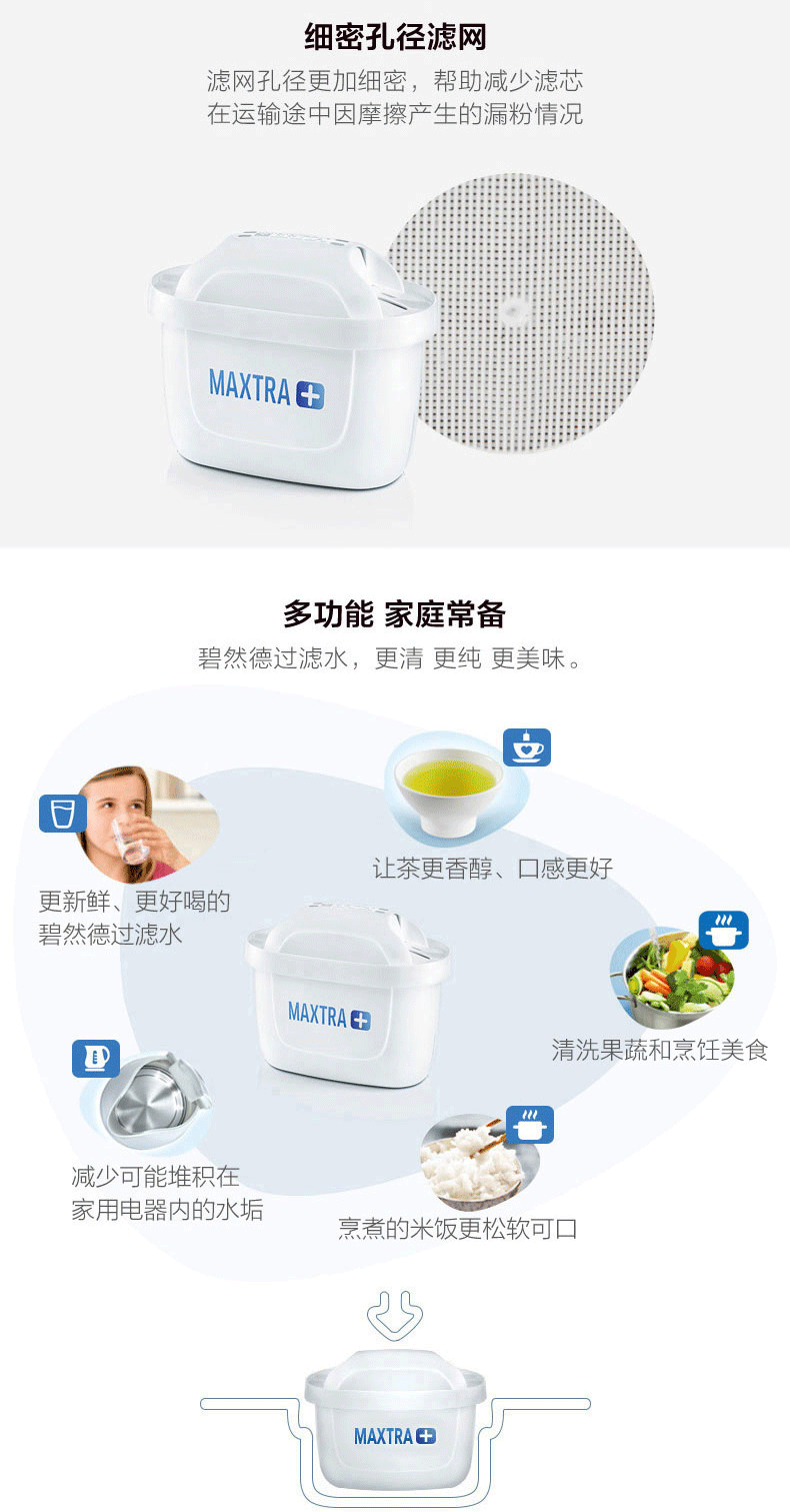 碧然德BRITA 全新升级的三代滤芯“Maxtra+”,内部装填有更大面积的“活性炭颗粒”,可吸附更多污染物,提升过滤效果以及延长使用时间,提升30%滤水效果,适用于目前所有滤水壶,无论新旧。