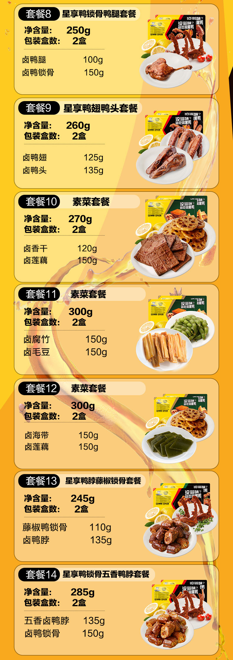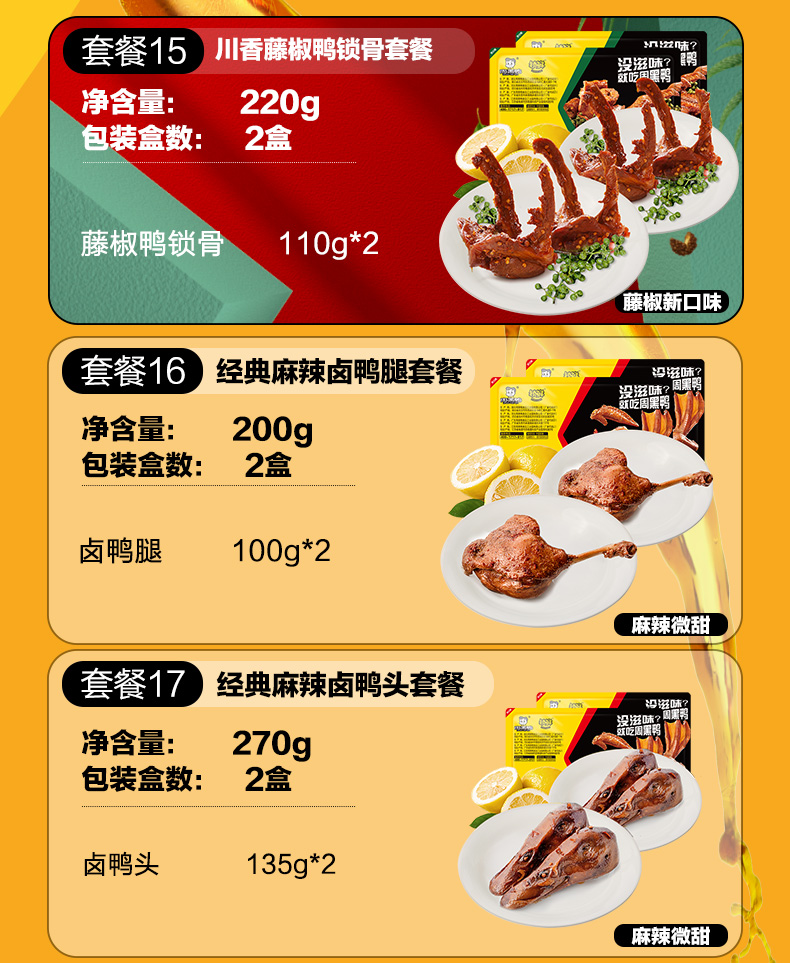 有鸭掌、鸭锁骨、鸭脖、鸭腿、鸭头、鸭翅、卤莲藕、卤香豆干可选,喜欢吃什么,自由组合。