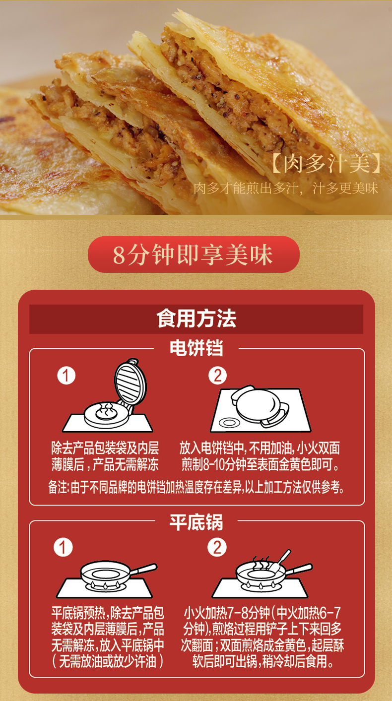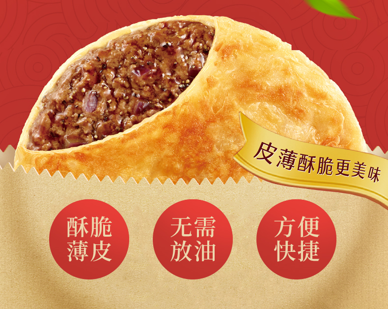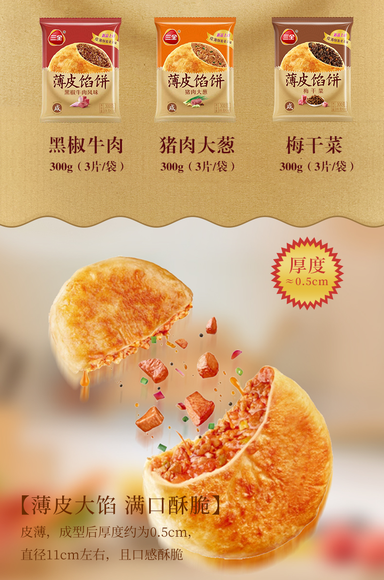 三全食品官方旗舰店出品,黑椒牛肉、猪肉大葱2种口味可选,精选优质原料,皮薄馅大,无需放油,电饼铛煎至8-10分钟就可食用,简单方便,还原家的味道,外皮焦香酥脆,回味无穷。