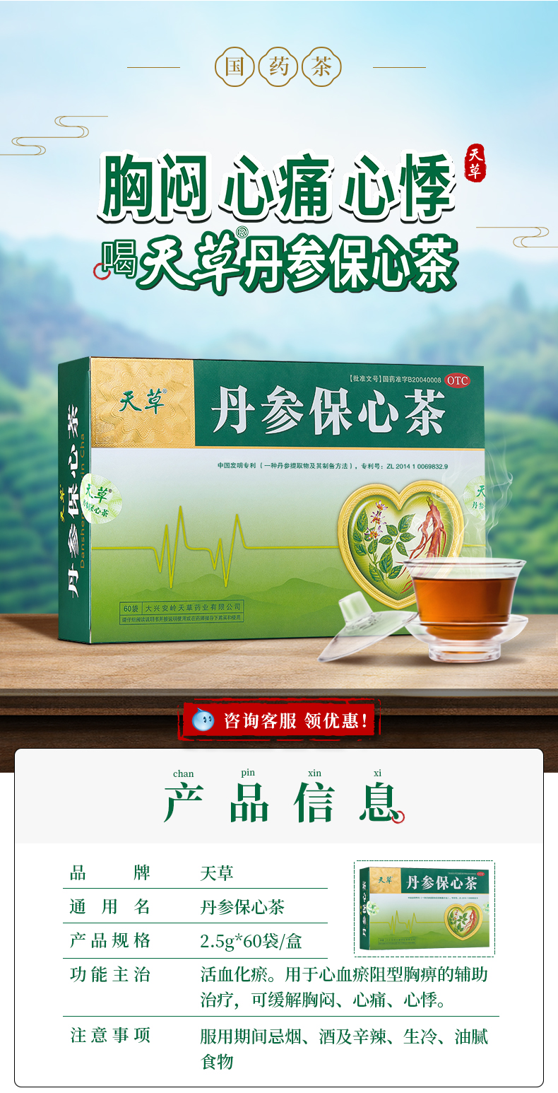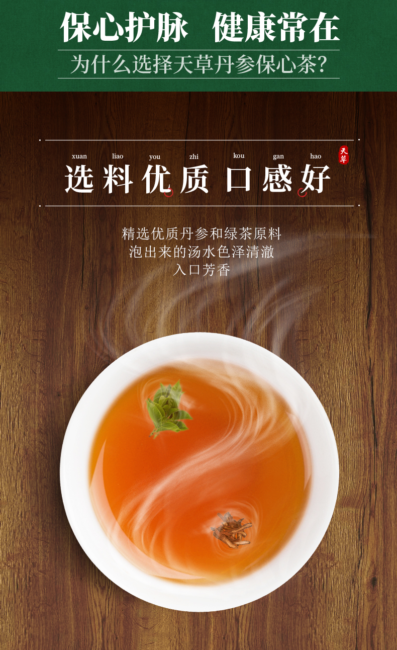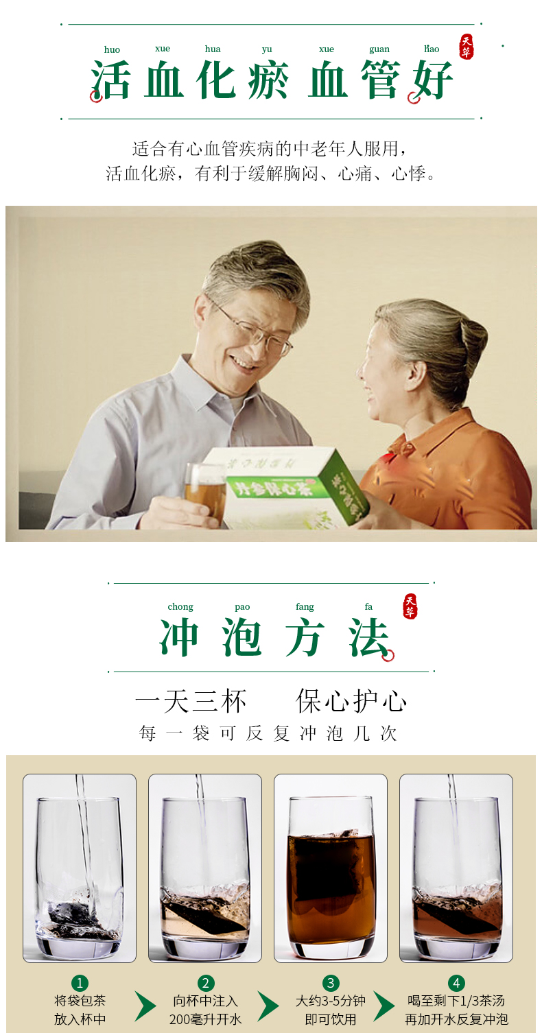 这款天草 丹参保心茶,精选优质丹参和绿茶原料泡出来的汤水色泽清澈,入口芳香,适合有心血管疾病的中老年人服用,能活血化瘀,可缓解胸闷、心痛、心悸症状,用于心血瘀阻型胸痹的辅助治疗。