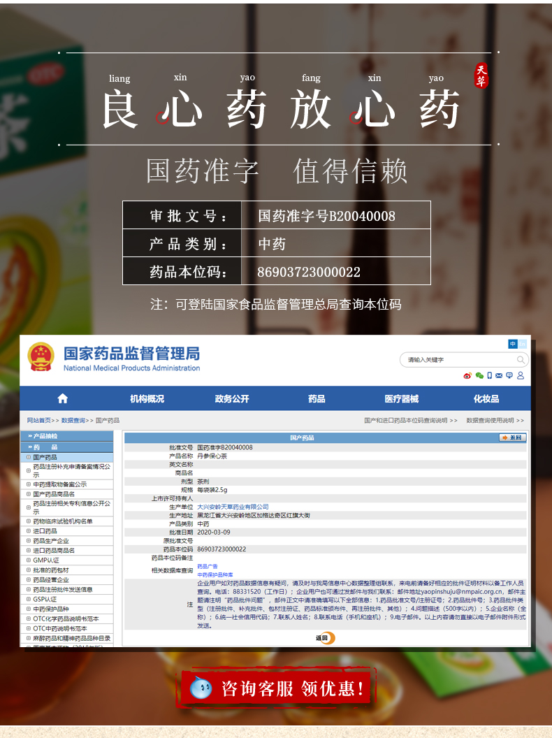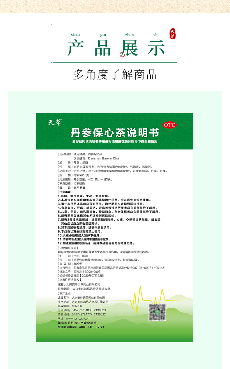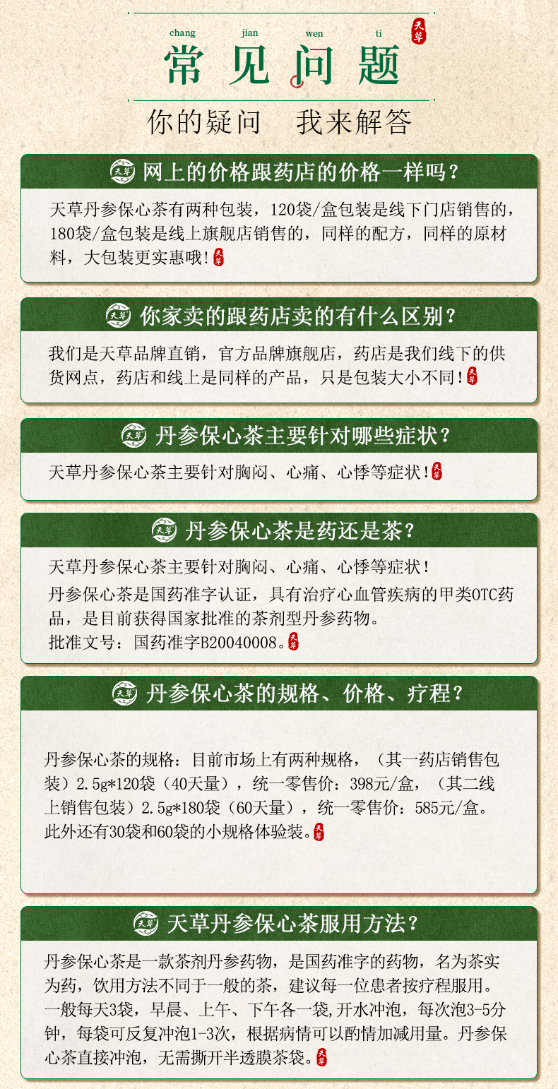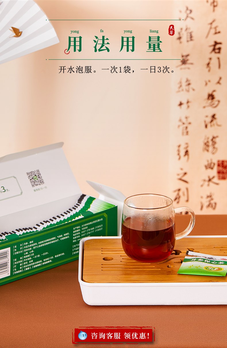 这款天草 丹参保心茶,精选优质丹参和绿茶原料泡出来的汤水色泽清澈,入口芳香,适合有心血管疾病的中老年人服用,能活血化瘀,可缓解胸闷、心痛、心悸症状,用于心血瘀阻型胸痹的辅助治疗。