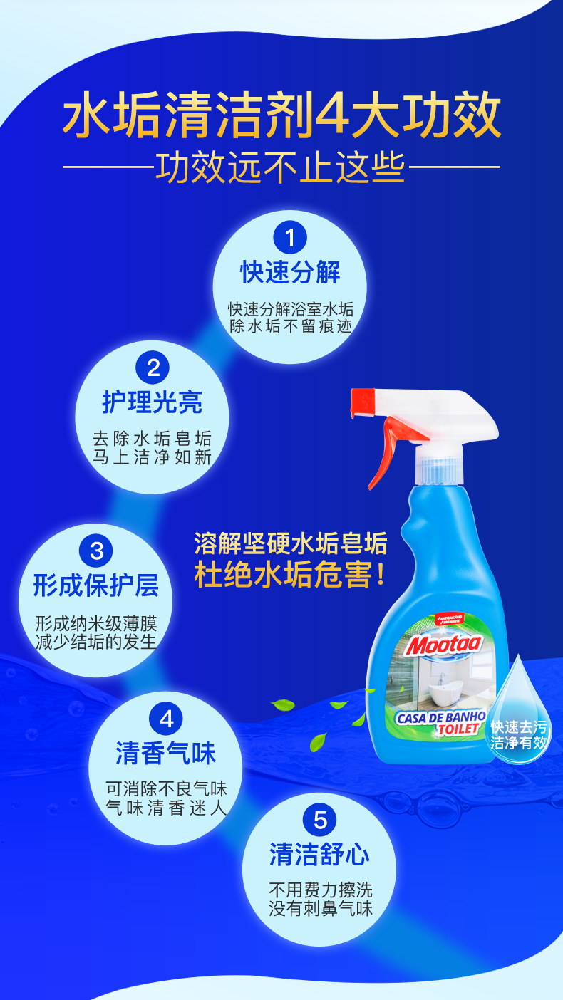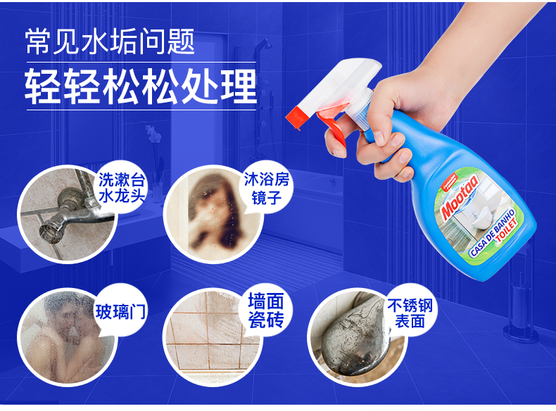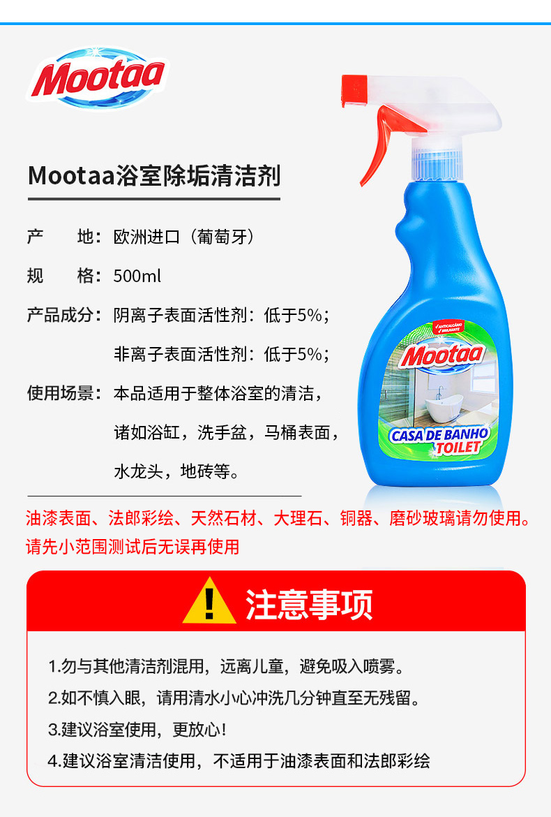 这款Mootaa 浴室玻璃/不锈钢 水垢清洁剂,葡萄牙原装进口,天然原料配方易清洗无残留,可用于清除花洒上的水渍、水垢,或者淋浴房玻璃上的油脂皮屑、皂垢污垢等,水龙头、浴缸、洗手盆、马桶、地砖等也都能用。