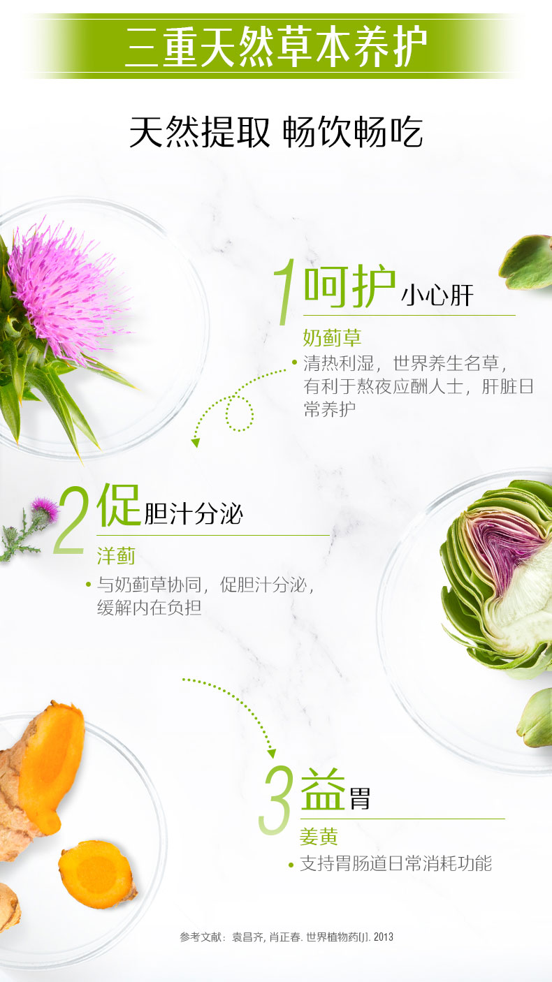 这款护肝片,选用三大传统草本植物为原料:奶蓟草,朝鲜蓟,姜黄。帮助促进胆汁分泌,抵抗对肝脏不利物质,帮助维持肝脏健康,分解脂肪,对抗自由基。有解酒醒酒,排毒养颜抗衰老,缓解消化不良的功效。