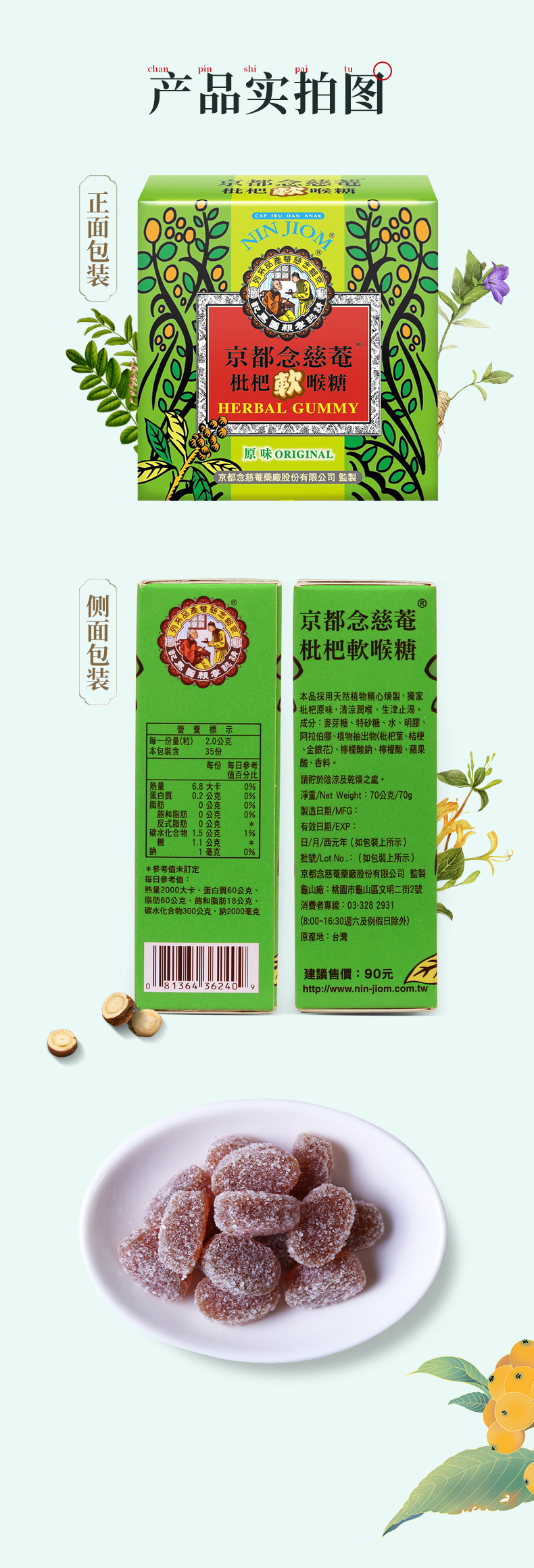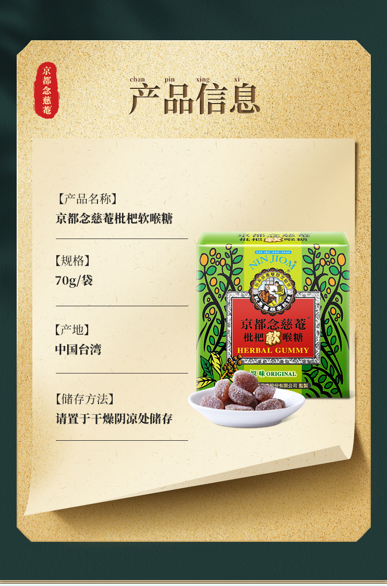这款京都念慈庵枇杷软喉糖,香港生产,以枇杷为主料,搭配金银花、桔梗、甘草等配料制成,具有润肺化痰、止咳平喘、护喉利咽、生津补气、调心降火的功效,适用于伤风咳嗽、痰稠、痰多气喘、咽喉干痒及声音嘶哑。