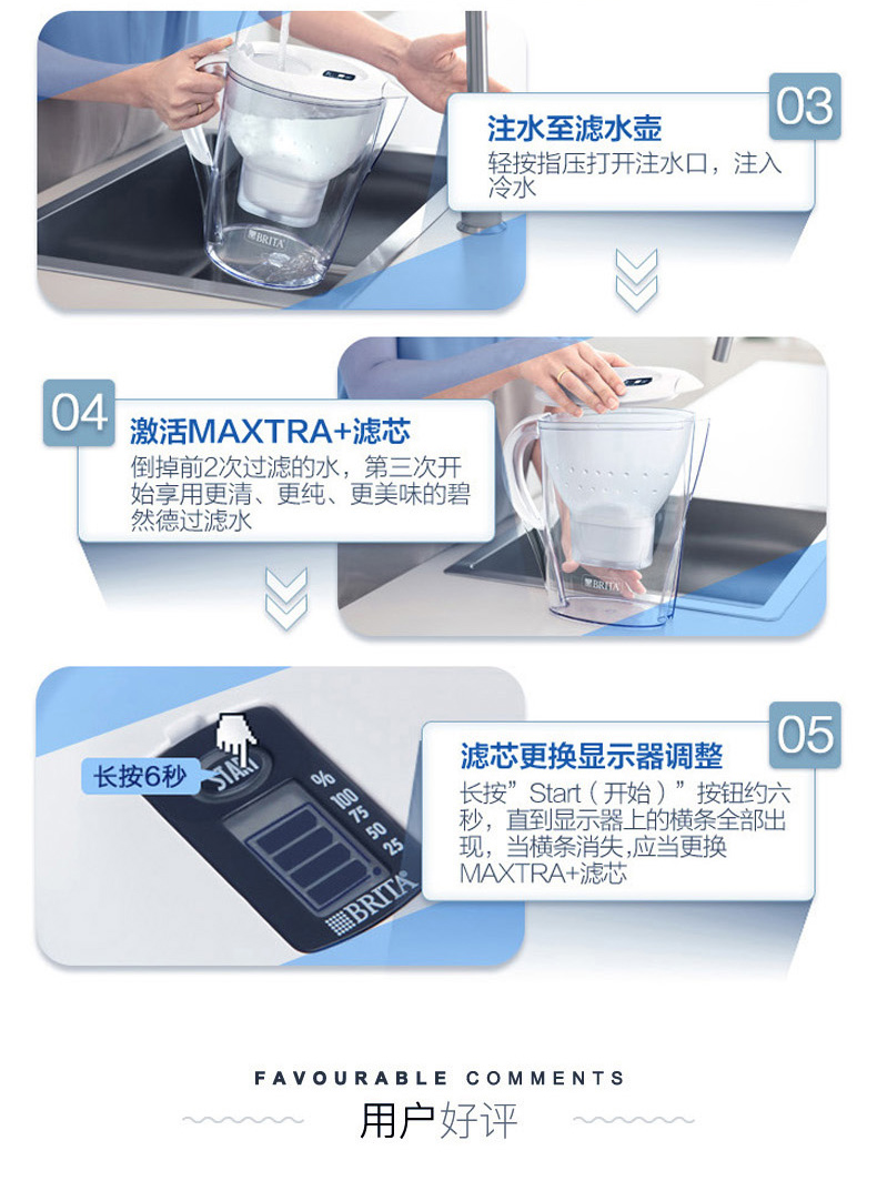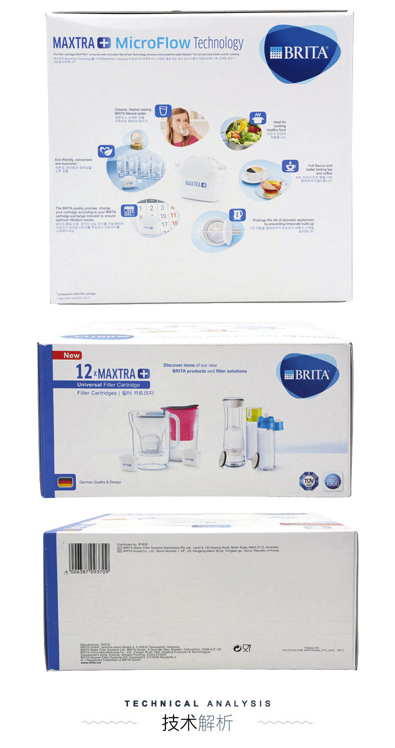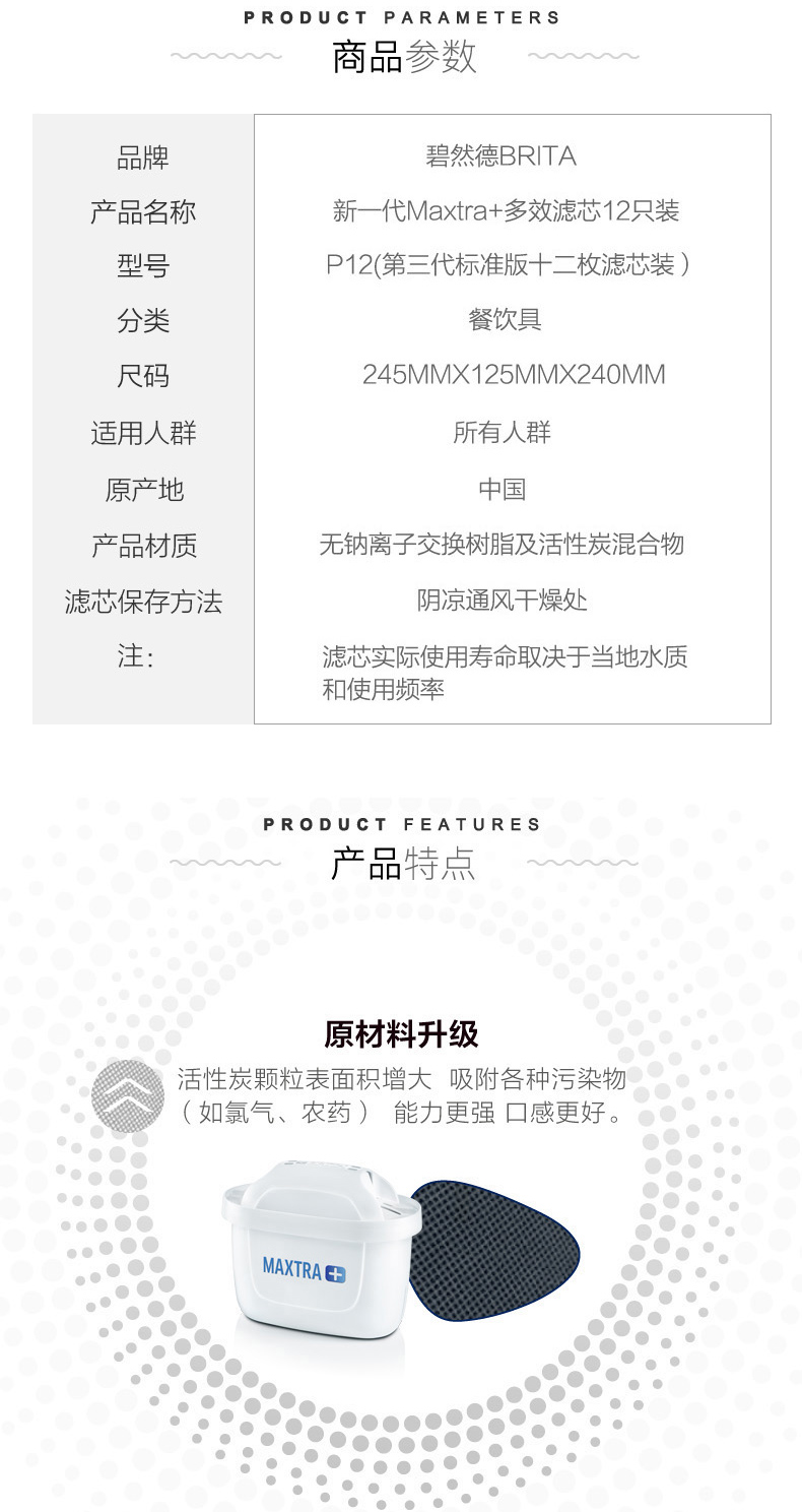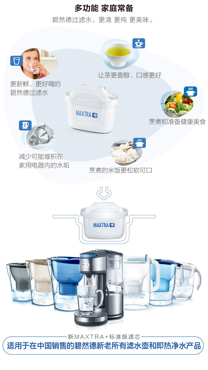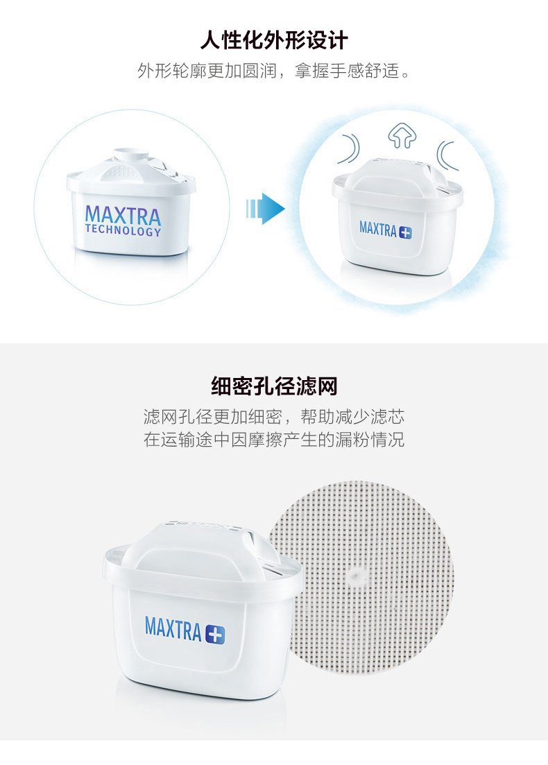 碧然德BRITA 全新升级的三代滤芯“Maxtra+”,内部装填有更大面积的“活性炭颗粒”,可吸附更多污染物,提升过滤效果以及延长使用时间,提升30%滤水效果,适用于目前所有滤水壶,无论新旧。