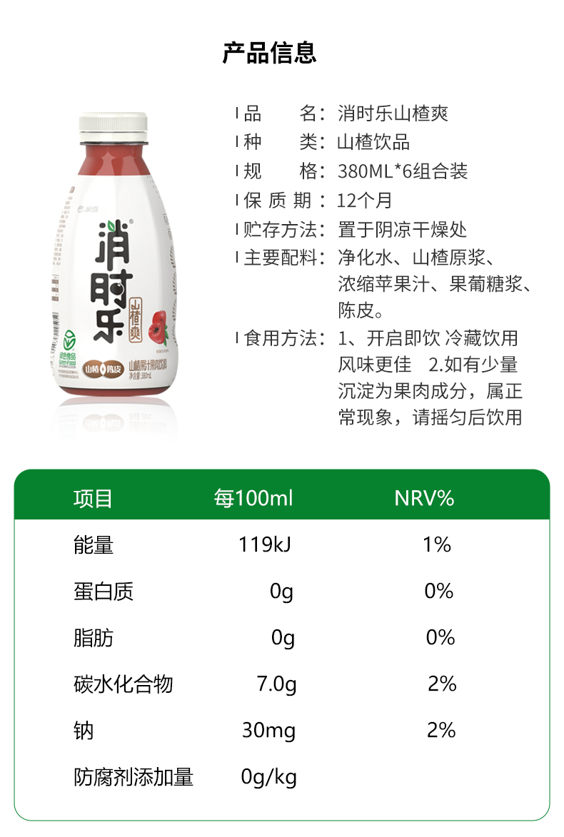 这款消时乐野生山楂汁,使用南太行山的野生山楂为原料,山楂果浆含量60%以上,有果汁和果肉,0色素、0防腐剂,口感纯正爽滑,酸甜适中,山楂有开胃健脾、消食化积解油腻的功效。