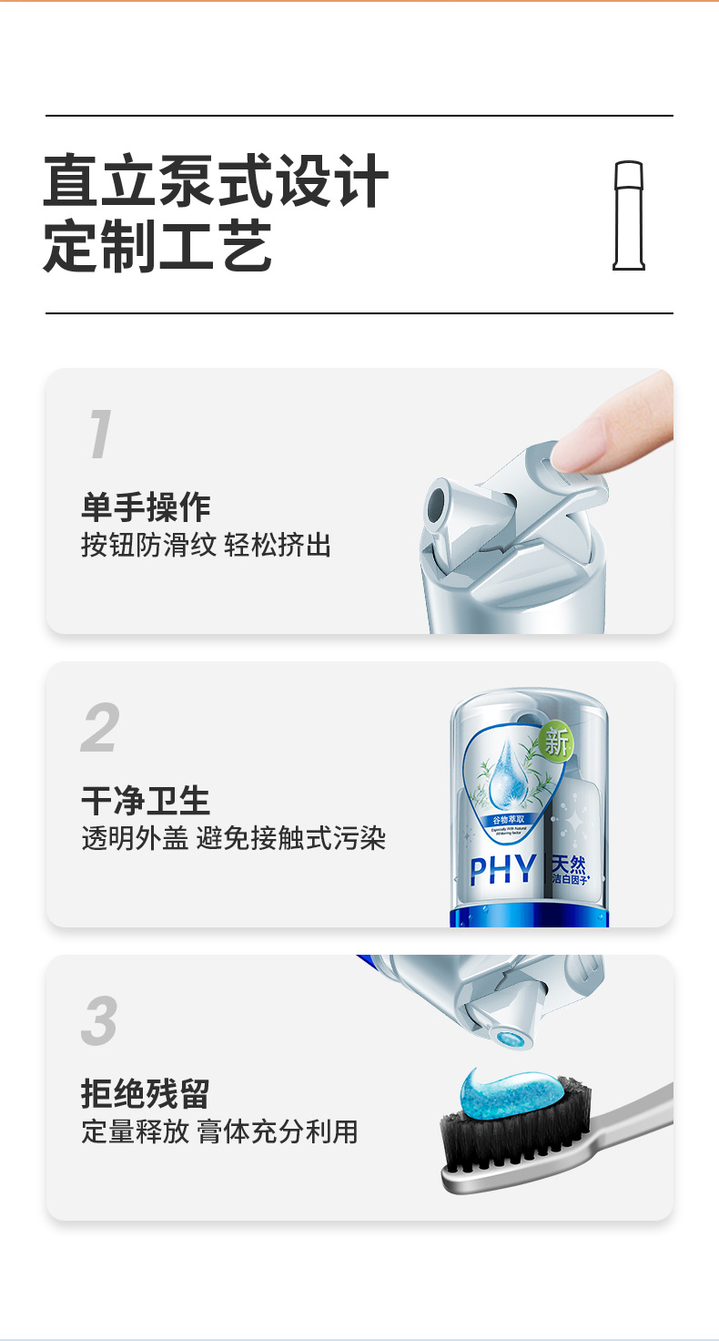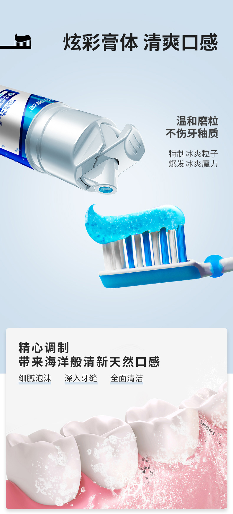 直立泵式牙膏,按压式设计,不用挤,使用方便节约。炫彩闪蓝色啫喱膏体,优选温和磨粒,不伤牙釉质,泡沫细腻丰盈,深入齿缝,全面清洁口腔。
