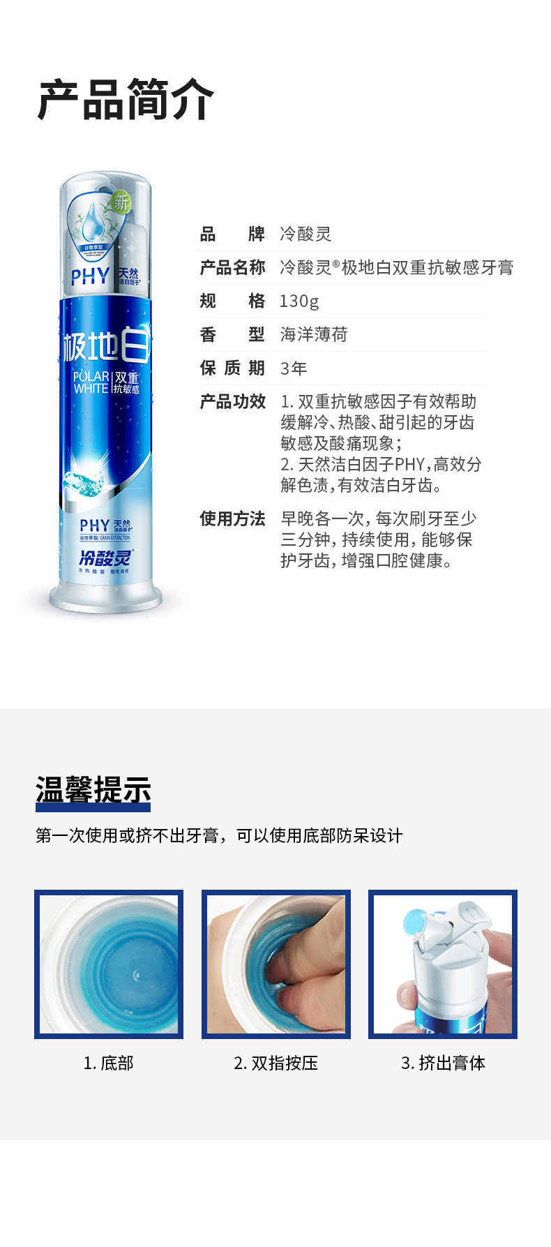 这款冷酸灵牙膏,采用特有的双重抗敏感专利配方,专门针对冷、热、酸、甜等食物引起的牙齿敏感和酸痛现象;含有精心研制的ICE极地冰爽因子,在刷牙带来清凉感,一扫清晨起床的困倦感觉,还含有谷物中萃取的洁白因子(植酸钠),能有效分解色素及牙渍,持久美白牙齿。