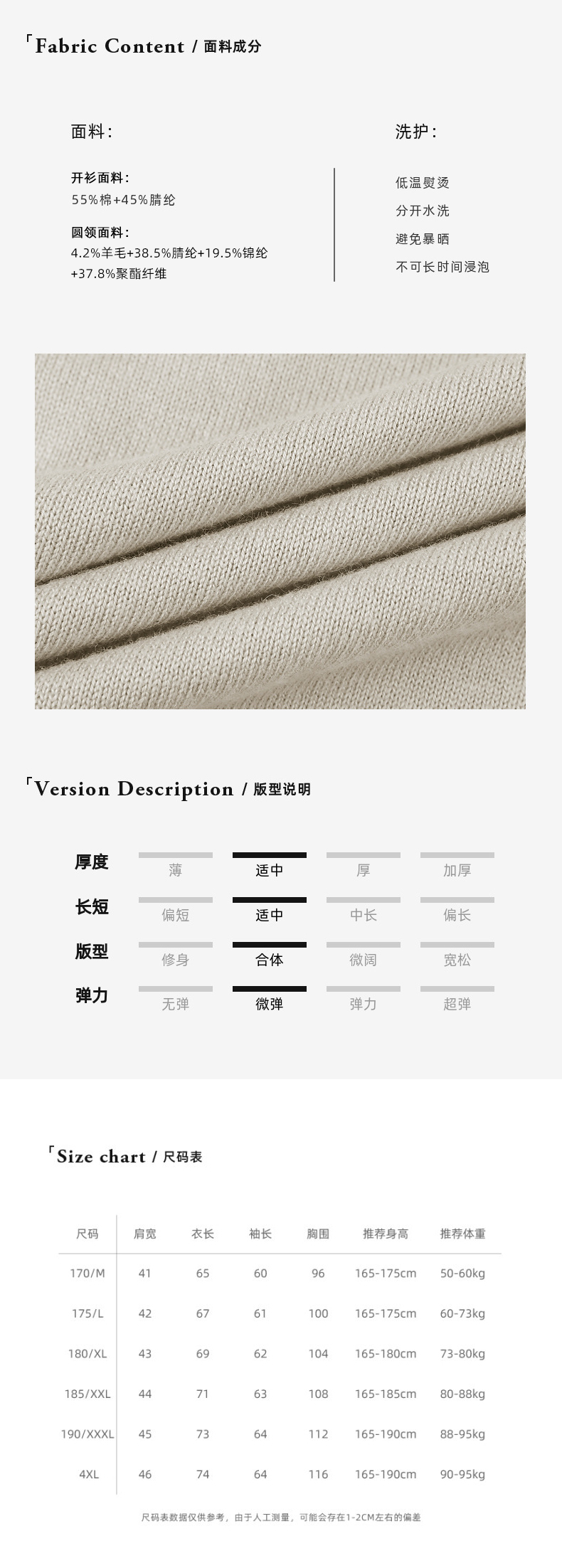 开衫款:48支棉腈混纺纱,舒适透气,色泽鲜艳,穿着舒适休闲,适合不同搭配。