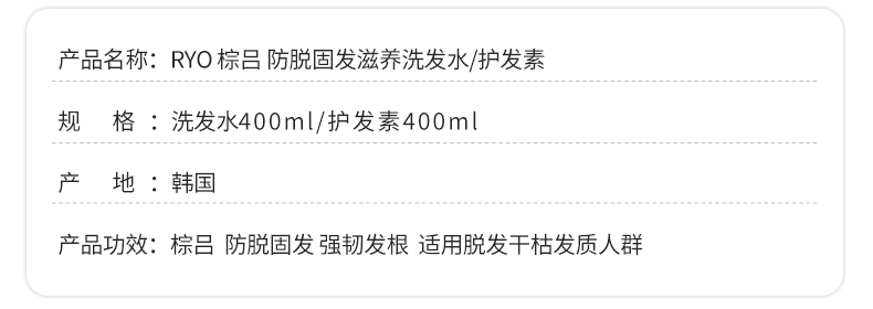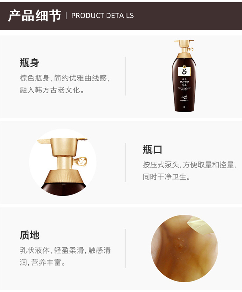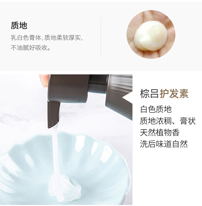 棕吕采用无农药认证的韩方配方,添加了柏子仁补气养血、强固发根;生地黄,激发生发细胞;川穹,活气行血;人参强固发根;红参,复脉固脱、益气摄血温和清洁、强健发根,镇静舒缓头皮、修补发丝,从发根处打造丰盈秀发。为脆弱发质提供几种营养护理。