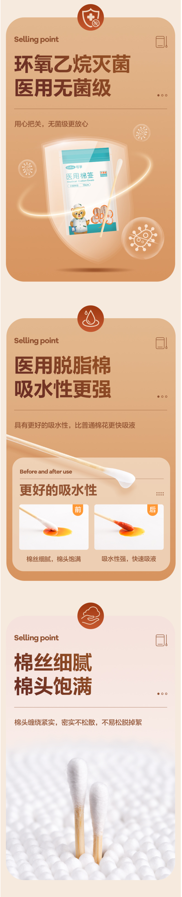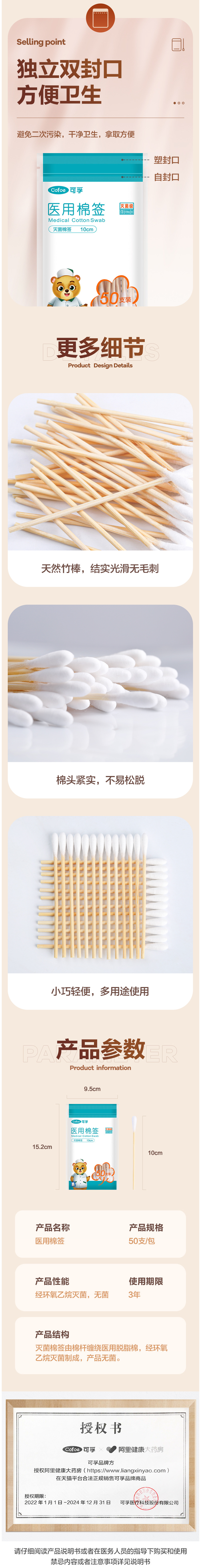 使用环氧乙烷灭菌,医用无菌级别。独立双封口,拿取方便,也能避免二次污染;天然竹棒,结实光滑无毛刺。
