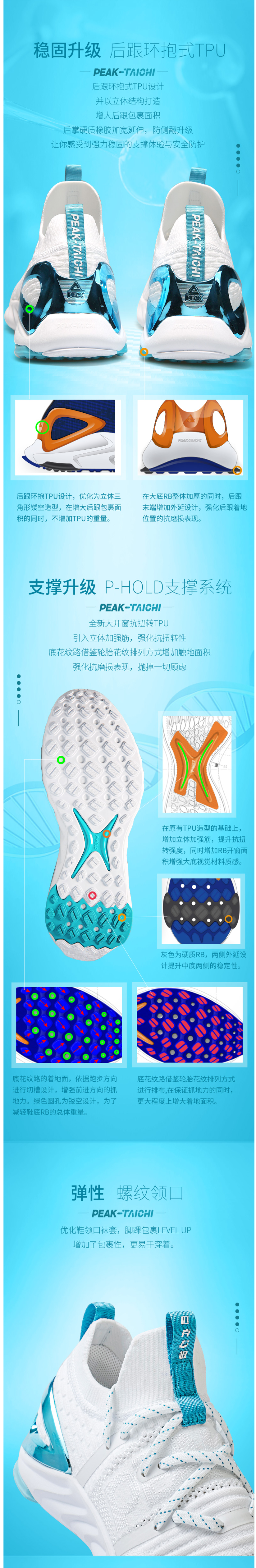 支撑系统上本次也再次改良,采用P-HOLD支撑系统。全新的开窗抗扭转TPU,引入立体加强筋,强化了鞋子的抗扭转性。稳定的环抱式后跟TPU,立体结构,且增加了后跟包裹面积,防止侧翻,让支撑更加稳定。鞋底纹路借鉴车胎花纹排列,增加了抗磨性与抓地力。