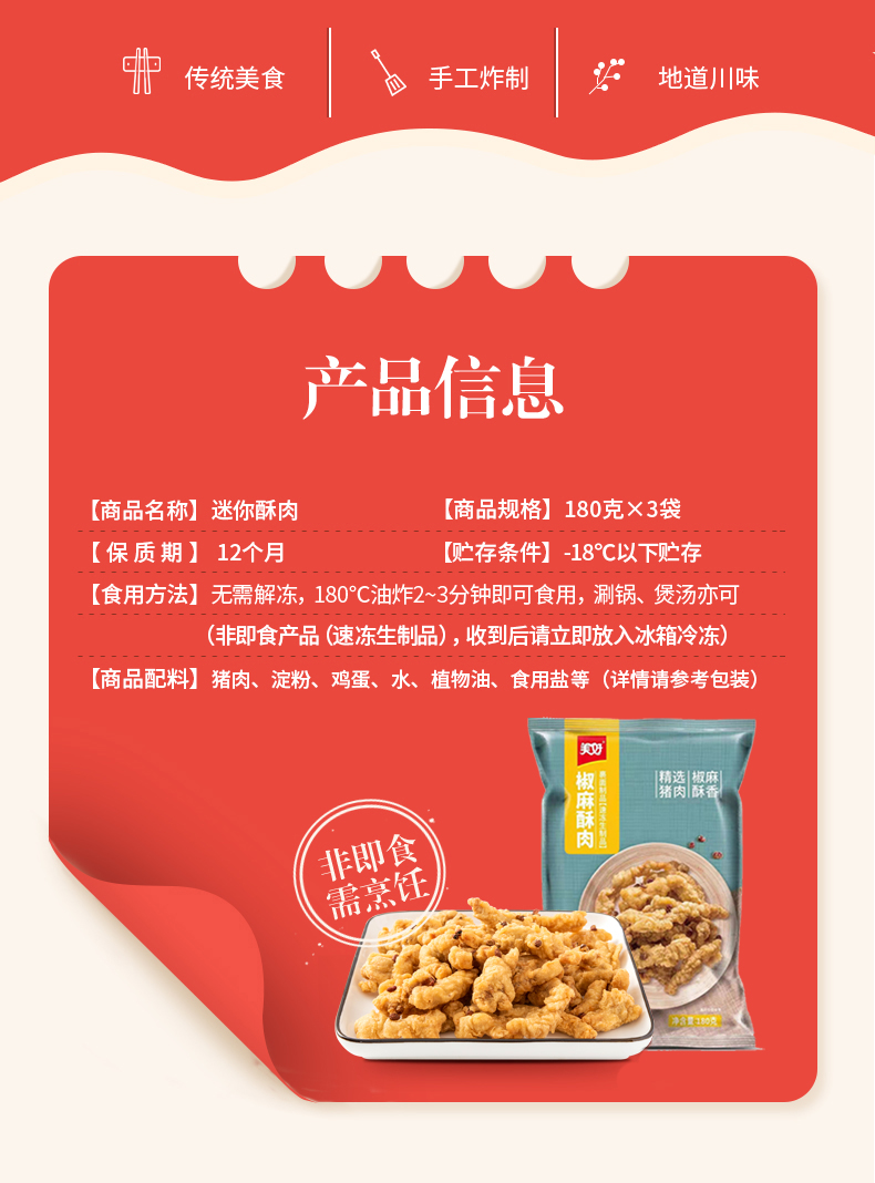 天猫绿际旗舰店49.8元,可领20元优惠券,实付29.8元到手。这款美好 椒麻小酥肉,精选猪后腿肉,辅以新鲜鸡蛋和地道四川汉源花椒,手工制作,农家风味,每一根都有家的味道。油炸后配上辣椒蘸碟,椒麻酥香;煮汤配青菜,大人小孩都喜欢;搭配番茄酱,香甜可口 。
